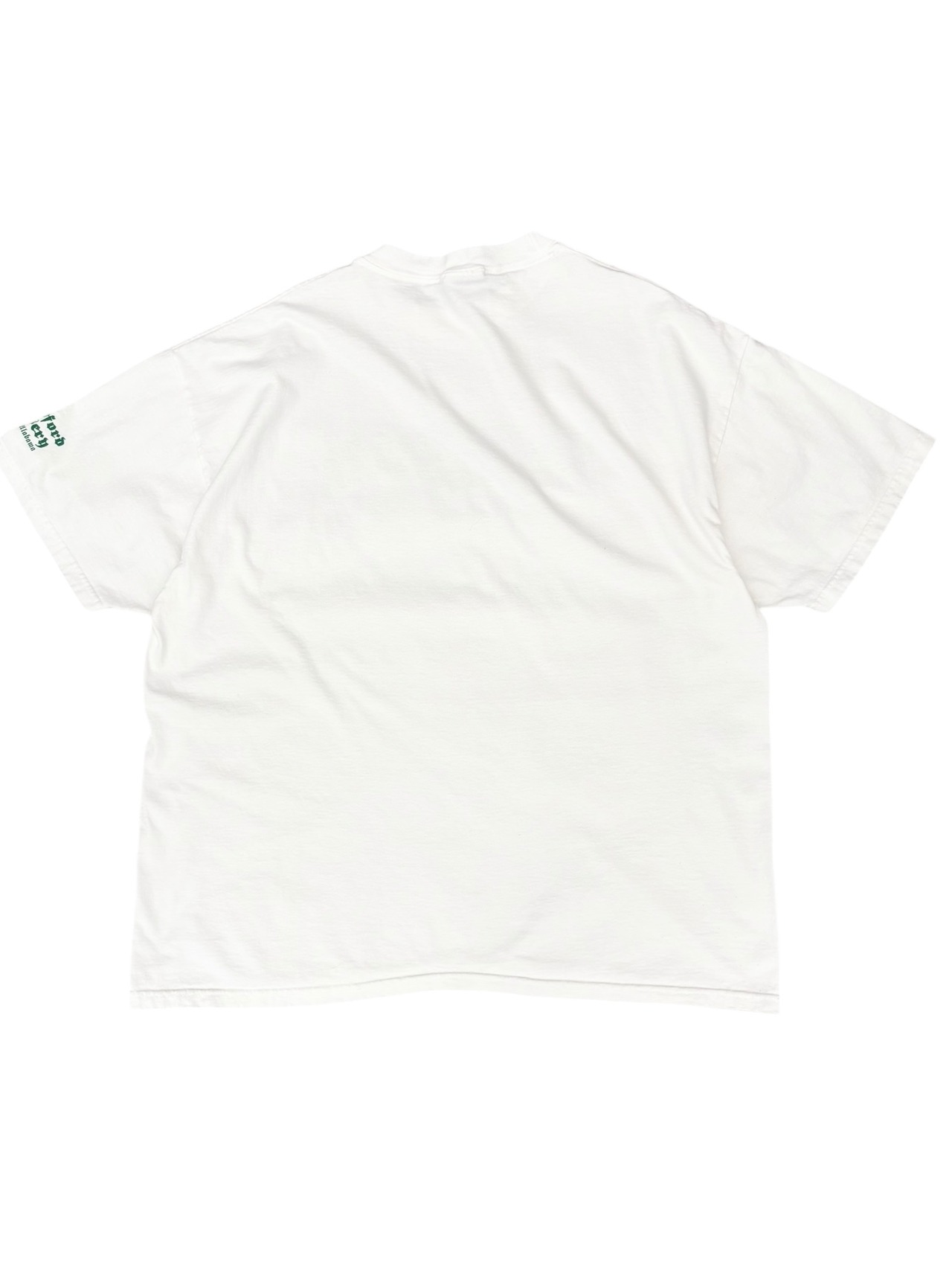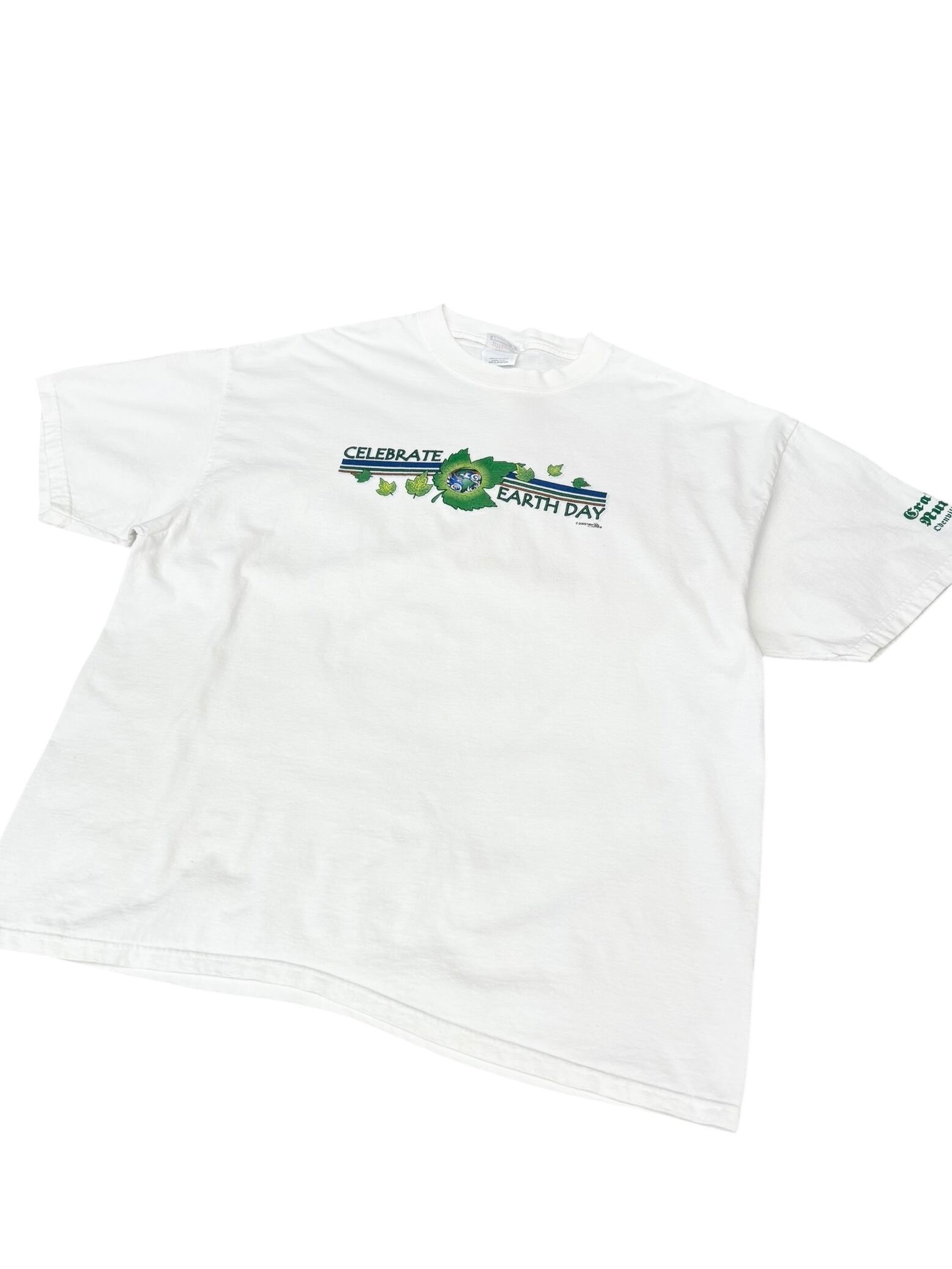 中央には地球と葉が融合したようなユニークなアートが施され、サイドには「Crawford Nursery」のプリントも。2002年製で、環境意識の高まりを感じさせる一枚です。コーデのアクセントとしてもおすすめ。