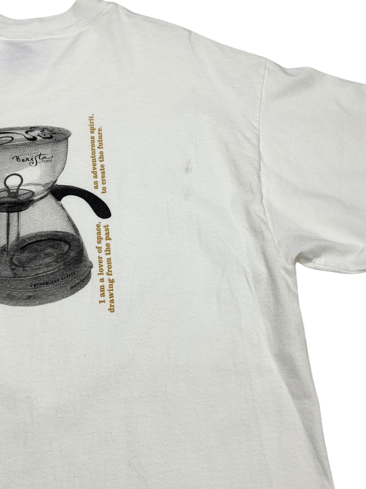 スターバックスのクラシックロゴと、ヴィンテージ調のコーヒーマシンがアートのようにプリントされた一枚。「THE PROMISE OF THE FUTURE EMERGES FROM THE BEAUTY OF THE PAST」のフレーズ。背面にはコーヒーメーカーのスケッチとともに、どこかノスタルジックな空気感が漂います。