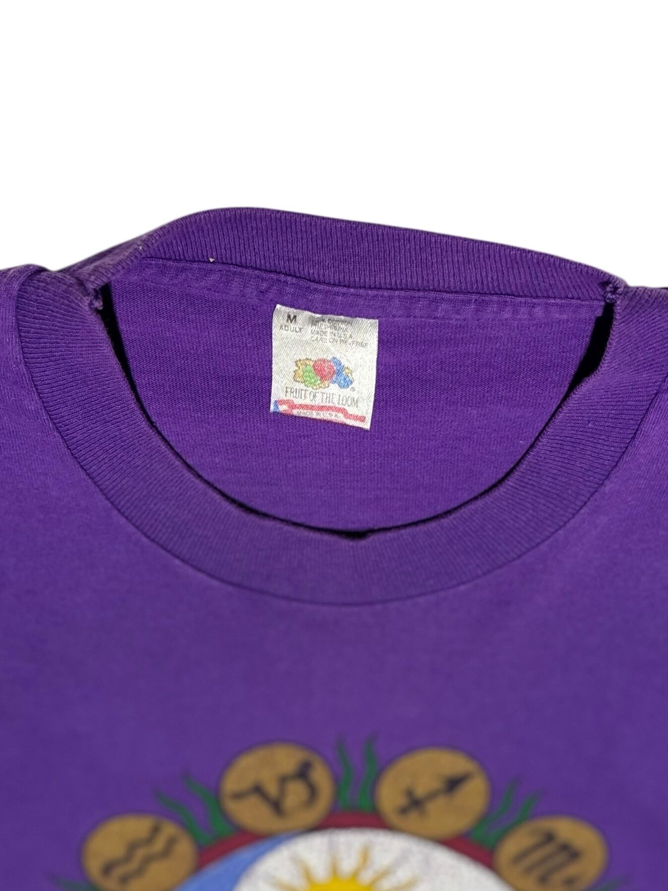 東海岸の観光地「Cape Hatteras(ノースカロライナ州)」で販売されていた、おそらくローカルサイケ系のおみやげTシャツ。フロントにはサン&ムーンの陰陽マークとともに、12星座のシンボルをぐるっと囲むように配置した宇宙感あふれるグラフィックがプリントされています。深みのあるパープルボディとヒビ割れたインクの質感が絶妙にマッチし、ヴィンテージならではの風合いに仕上がった1枚です。