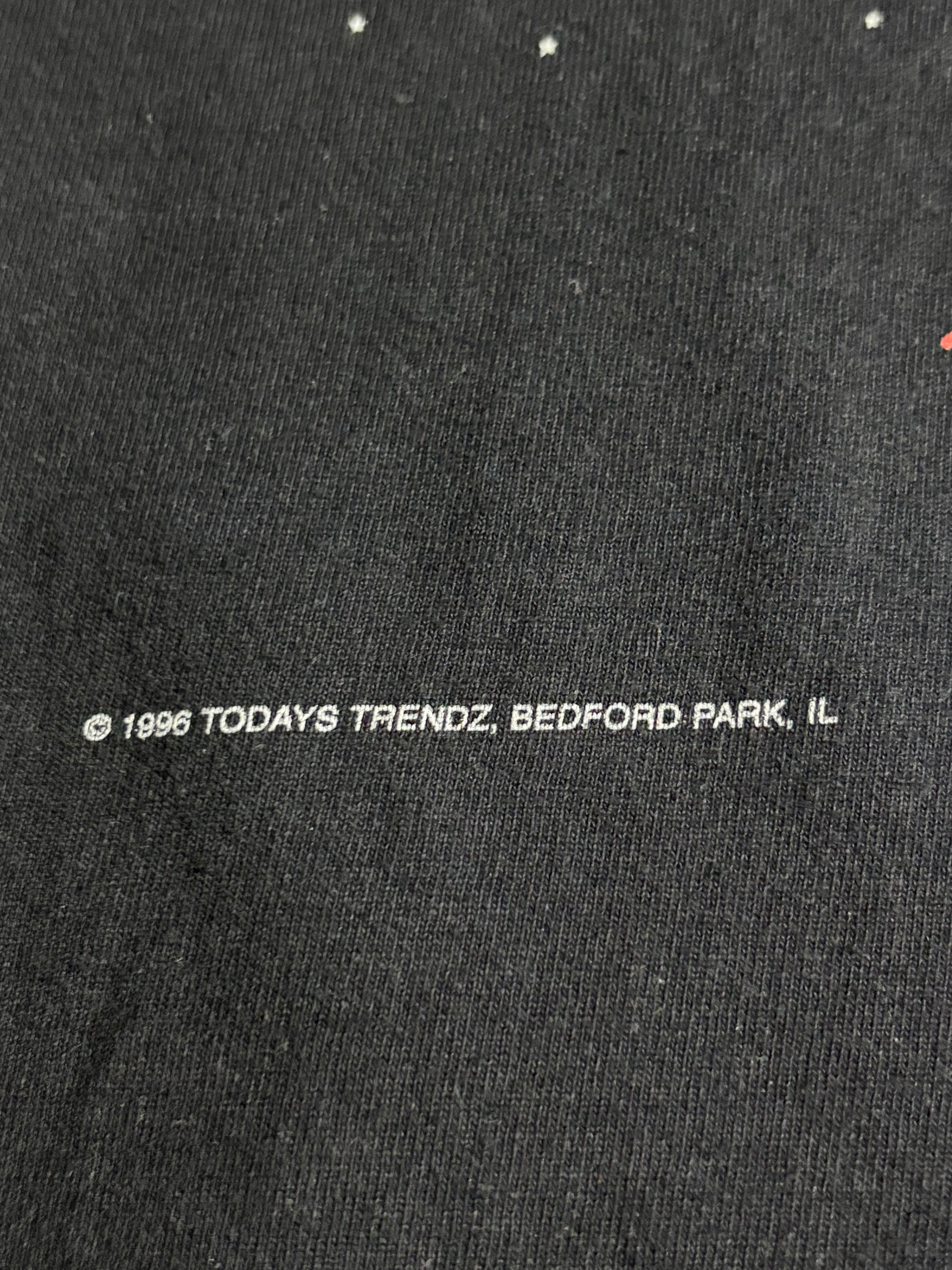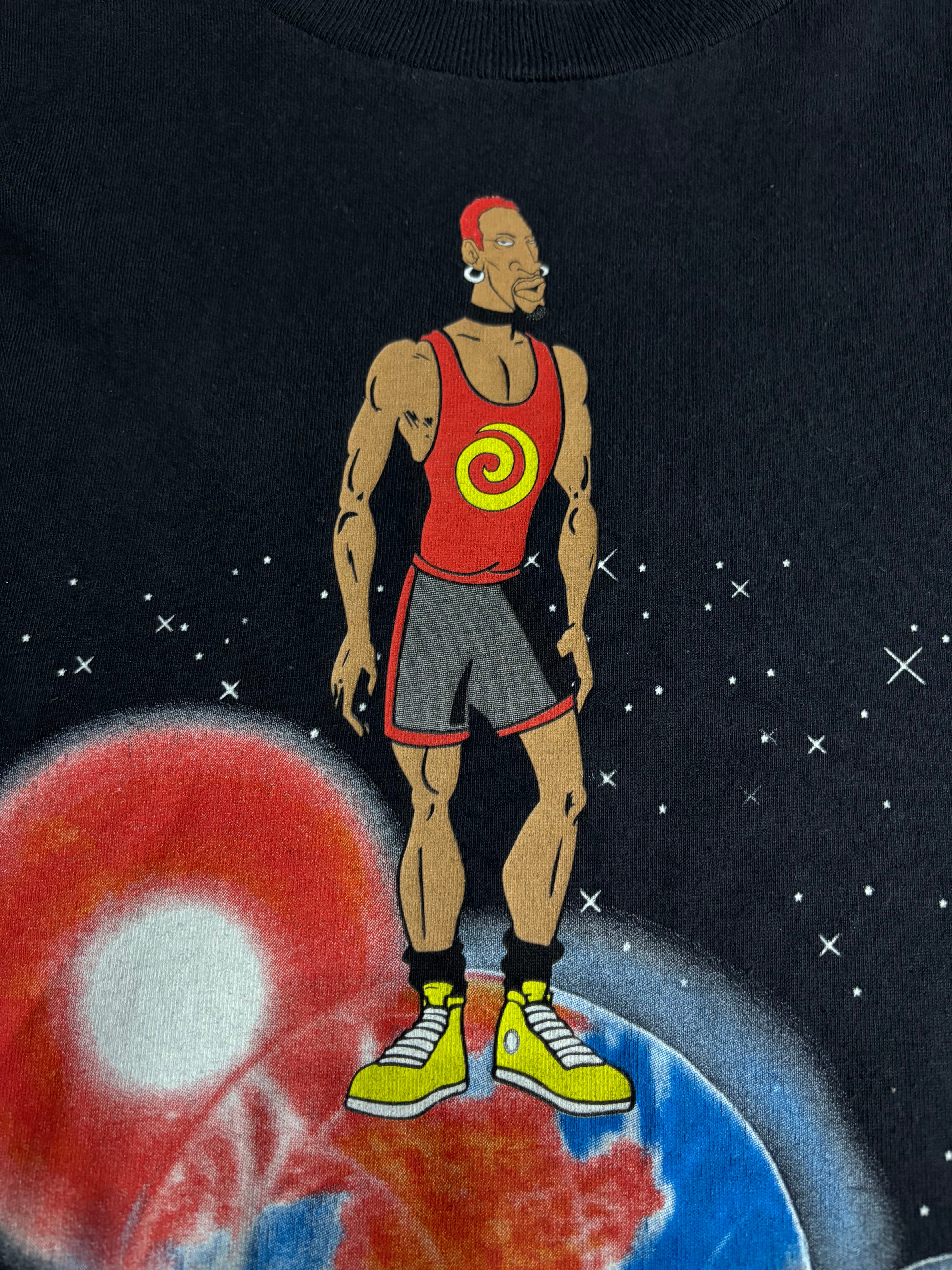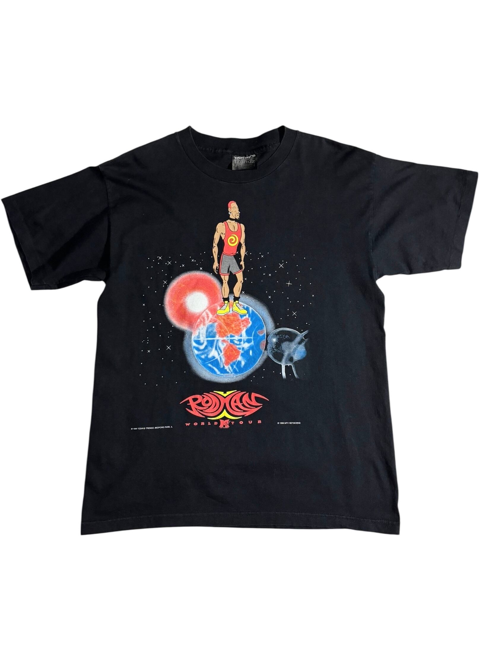 NBAを代表する“悪童”デニス・ロッドマンが1996年に行った「RODMAN WORLD TOUR」を記念して制作されたMTVコラボTシャツ。フロントには地球に立つロッドマンのキャラクターイラストとMTVロゴがデザインされ、90年代らしいポップカルチャーの融合を体現した一枚。NBAと音楽シーンを結びつけた希少なオフィシャルアイテムです。