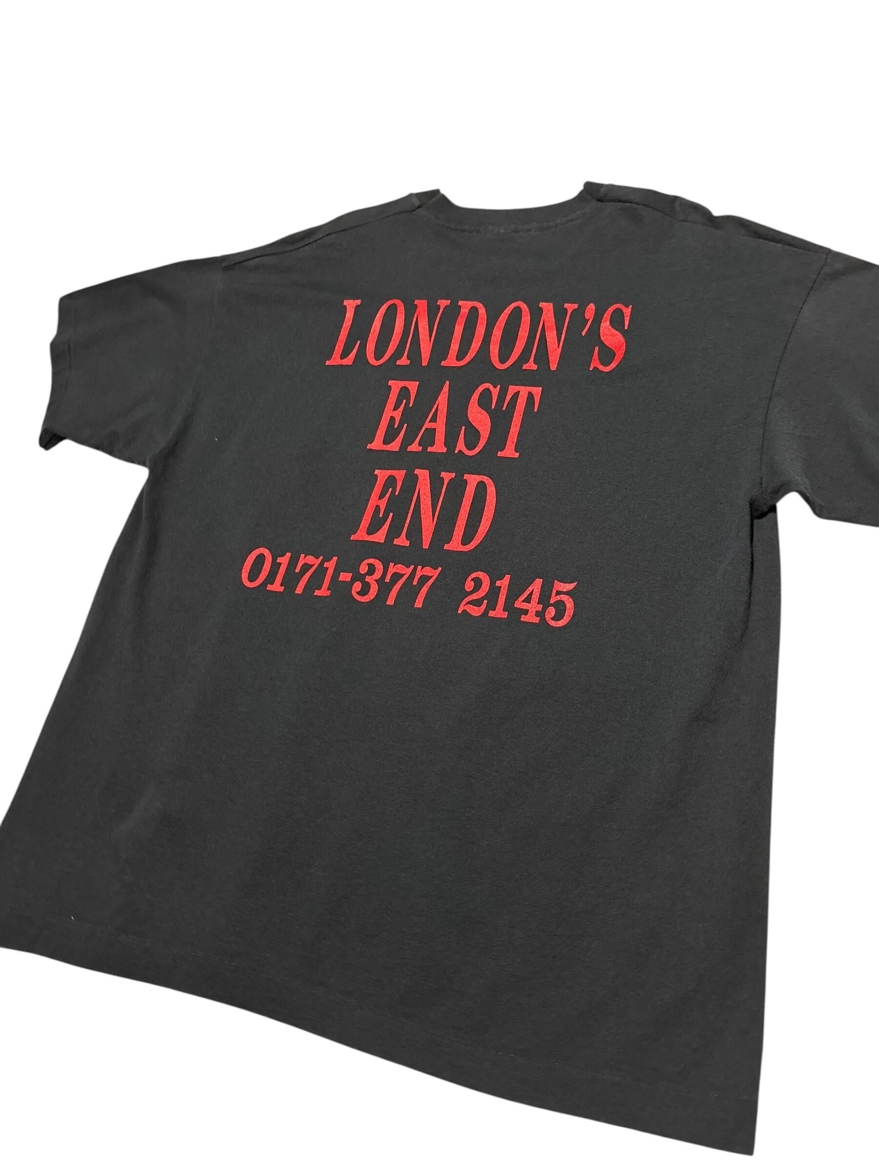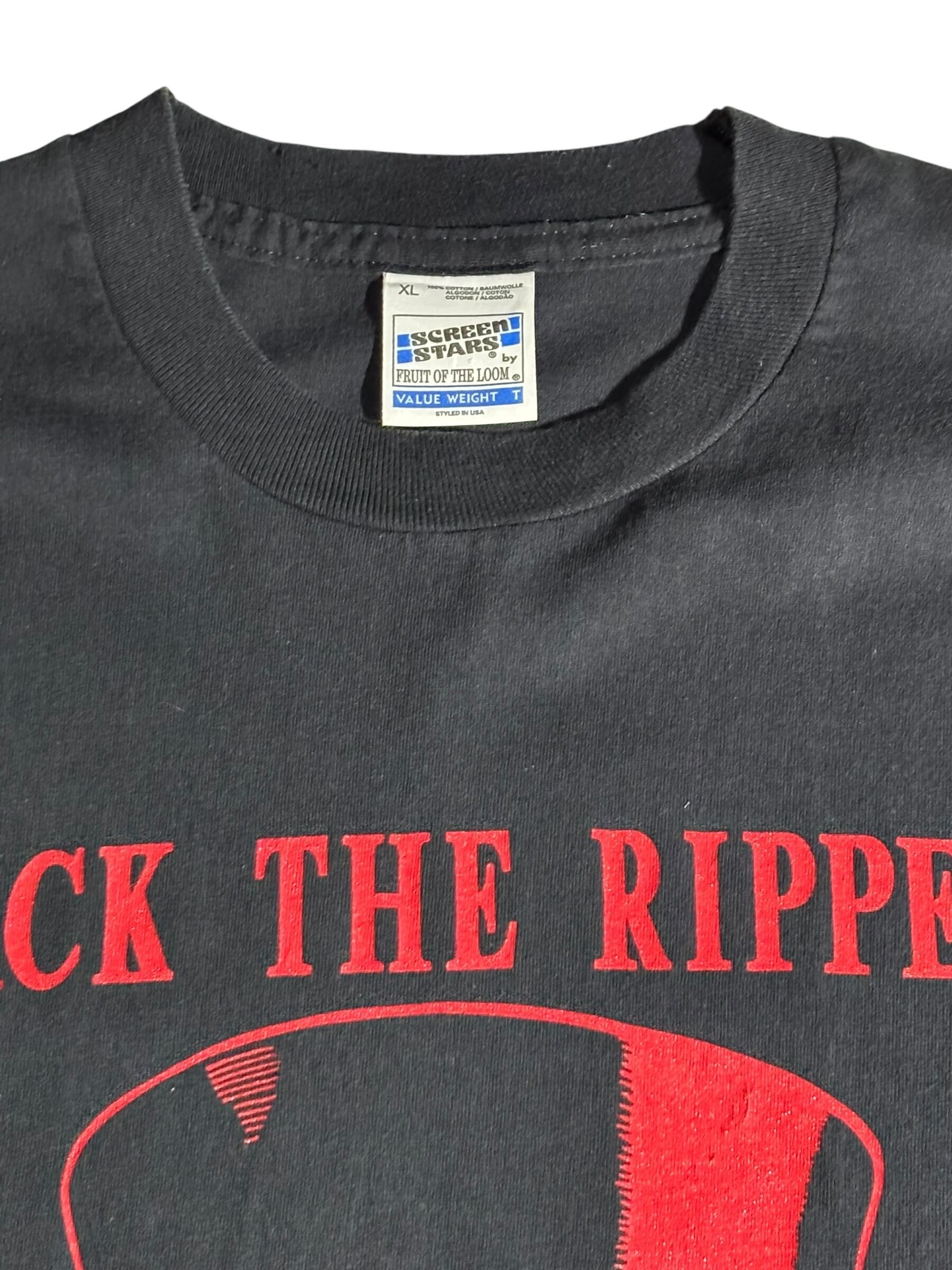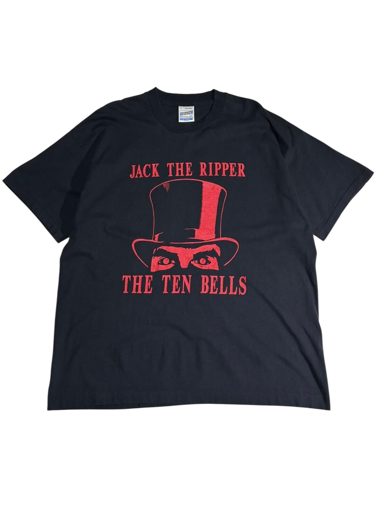 19世紀末ロンドンを震撼させた未解決事件「切り裂きジャック(Jack the Ripper)」と、そのゆかりのパブ「The Ten Bells」をモチーフにしたヴィンテージTシャツ。赤と黒のコントラストが映えるグラフィックで、ホラーやミステリーカルチャーを好む層に人気の高い一枚。アンダーグラウンドな雰囲気漂う90sカルチャーTとしても存在感抜群です。