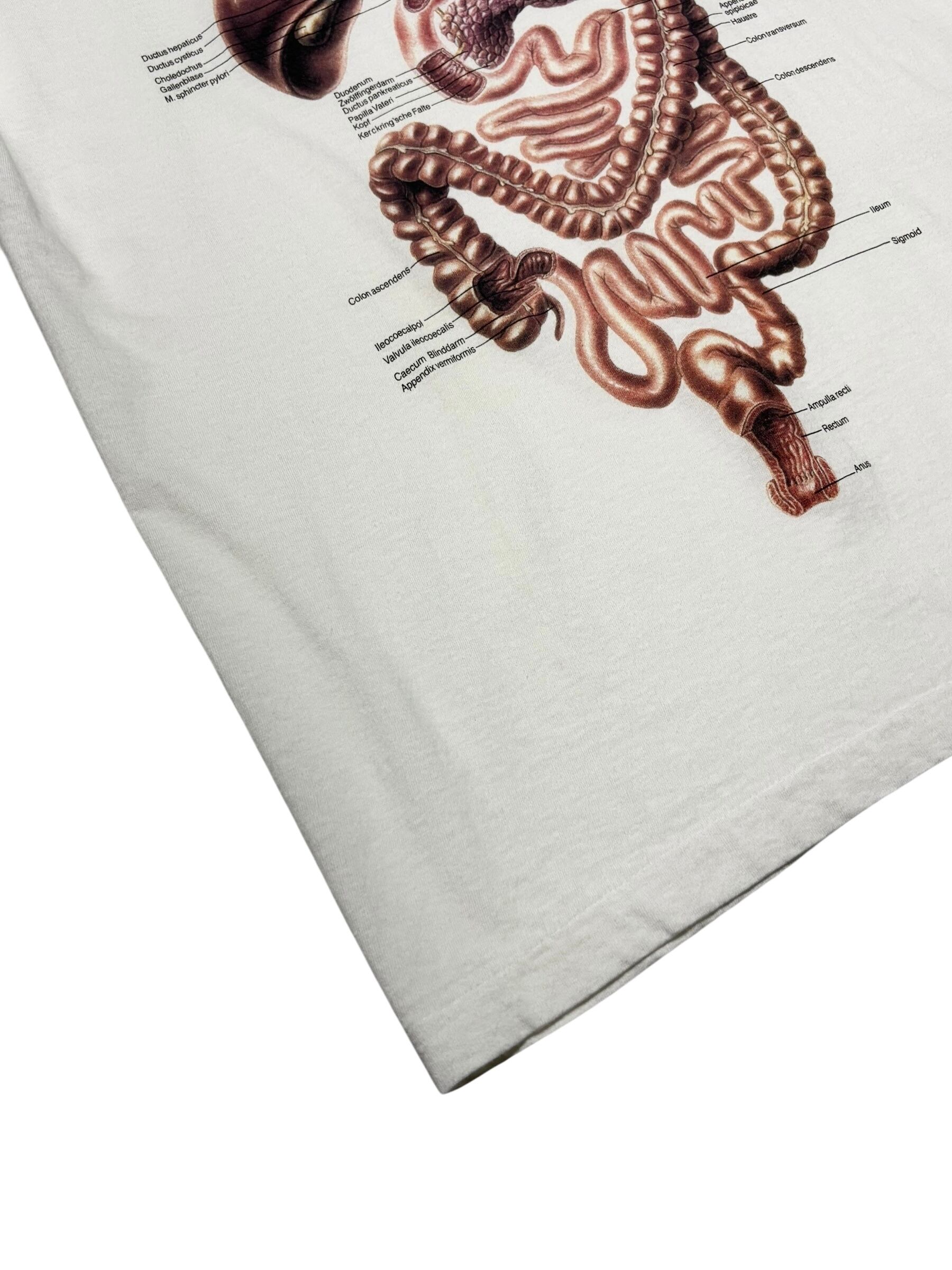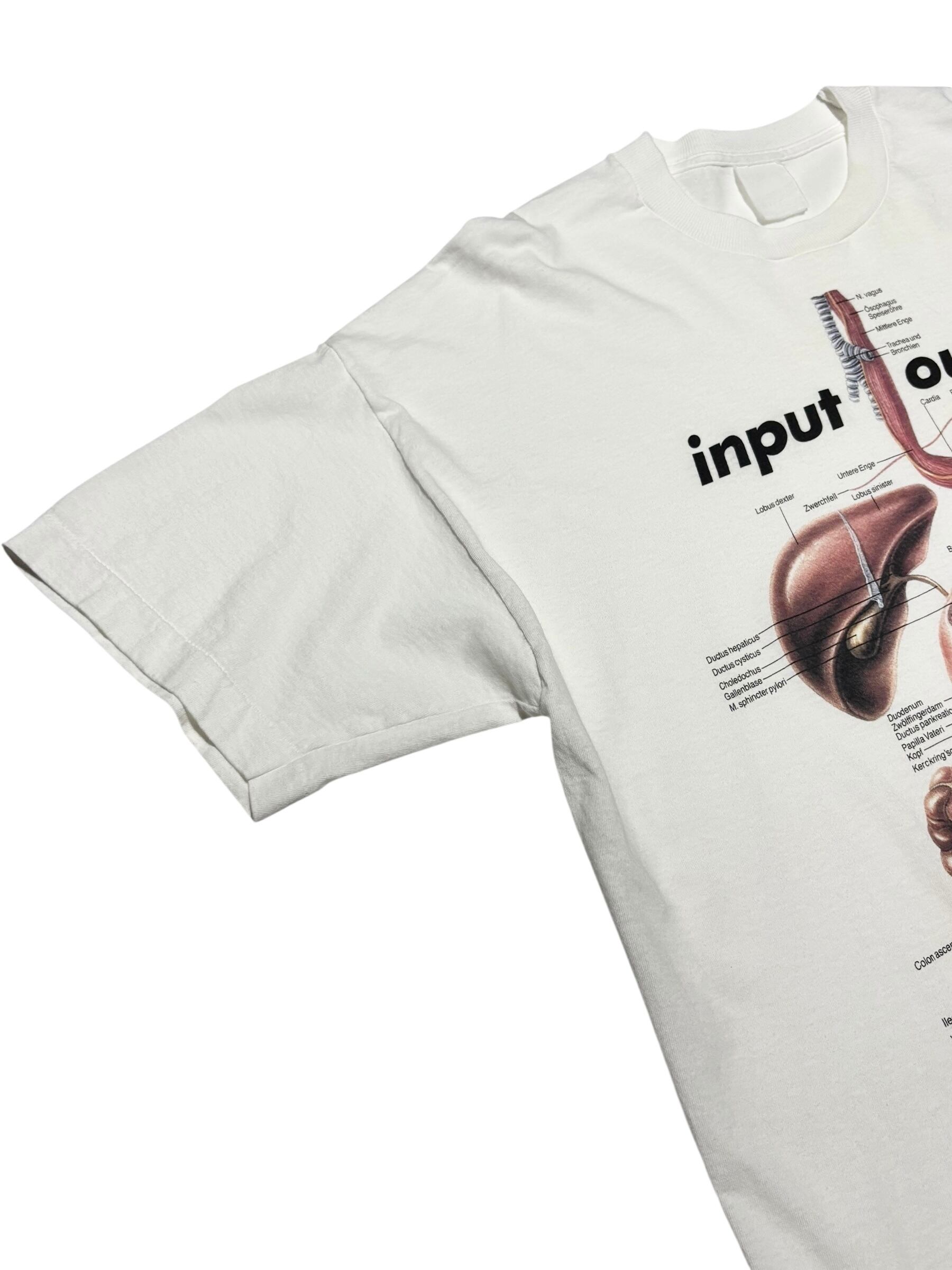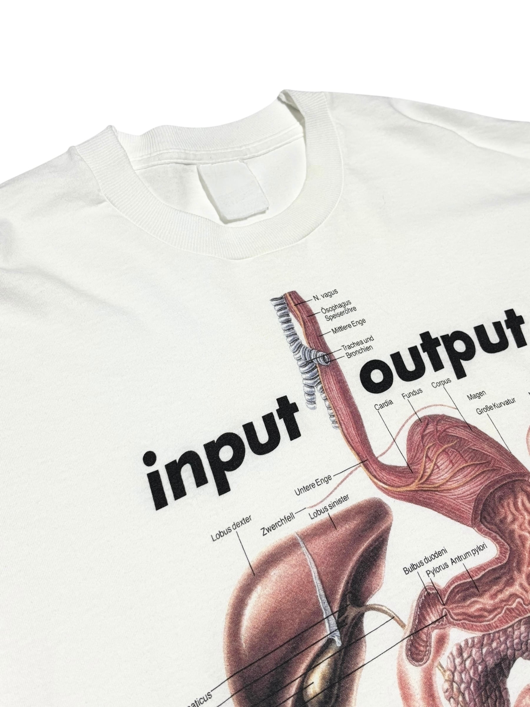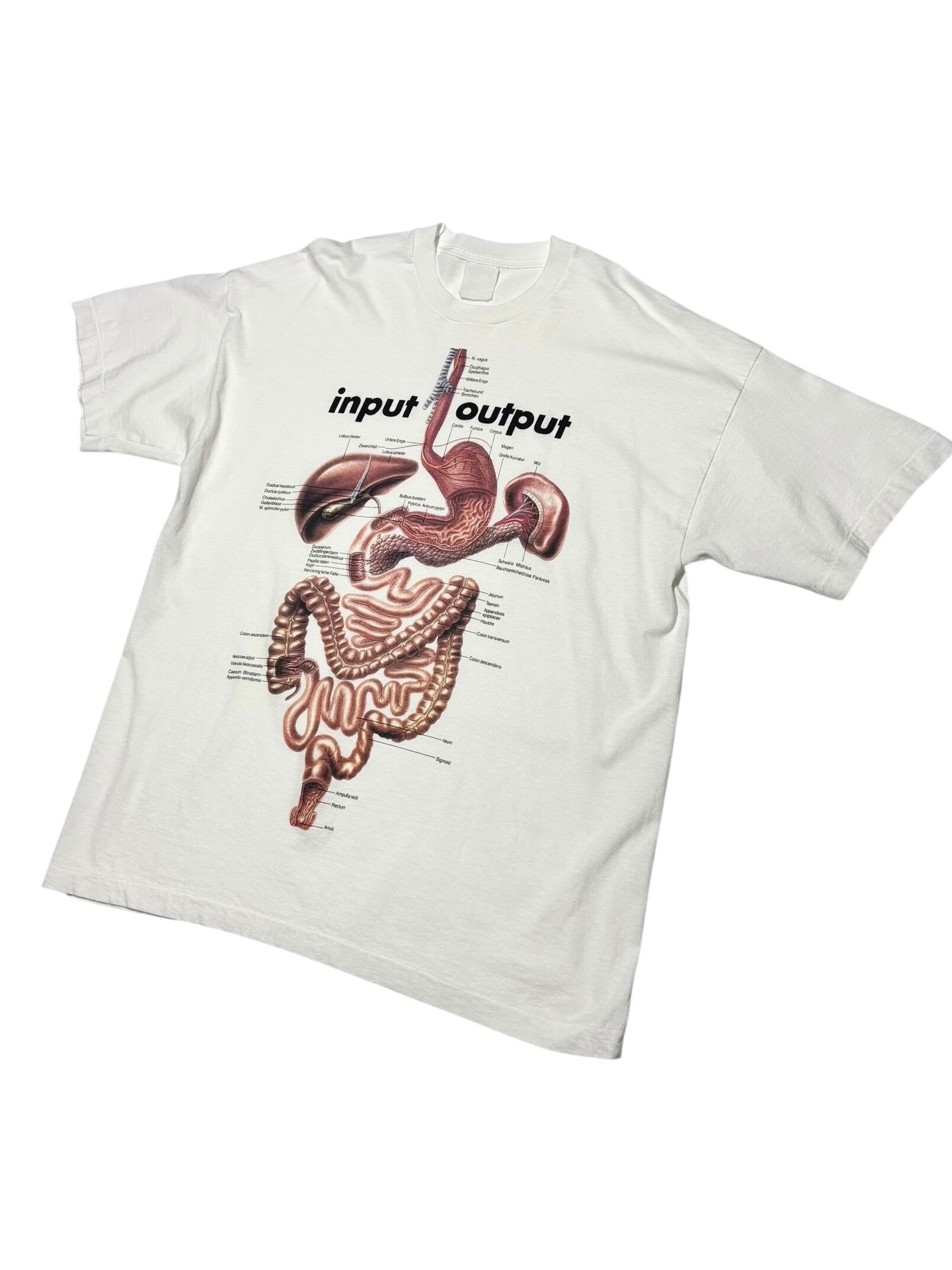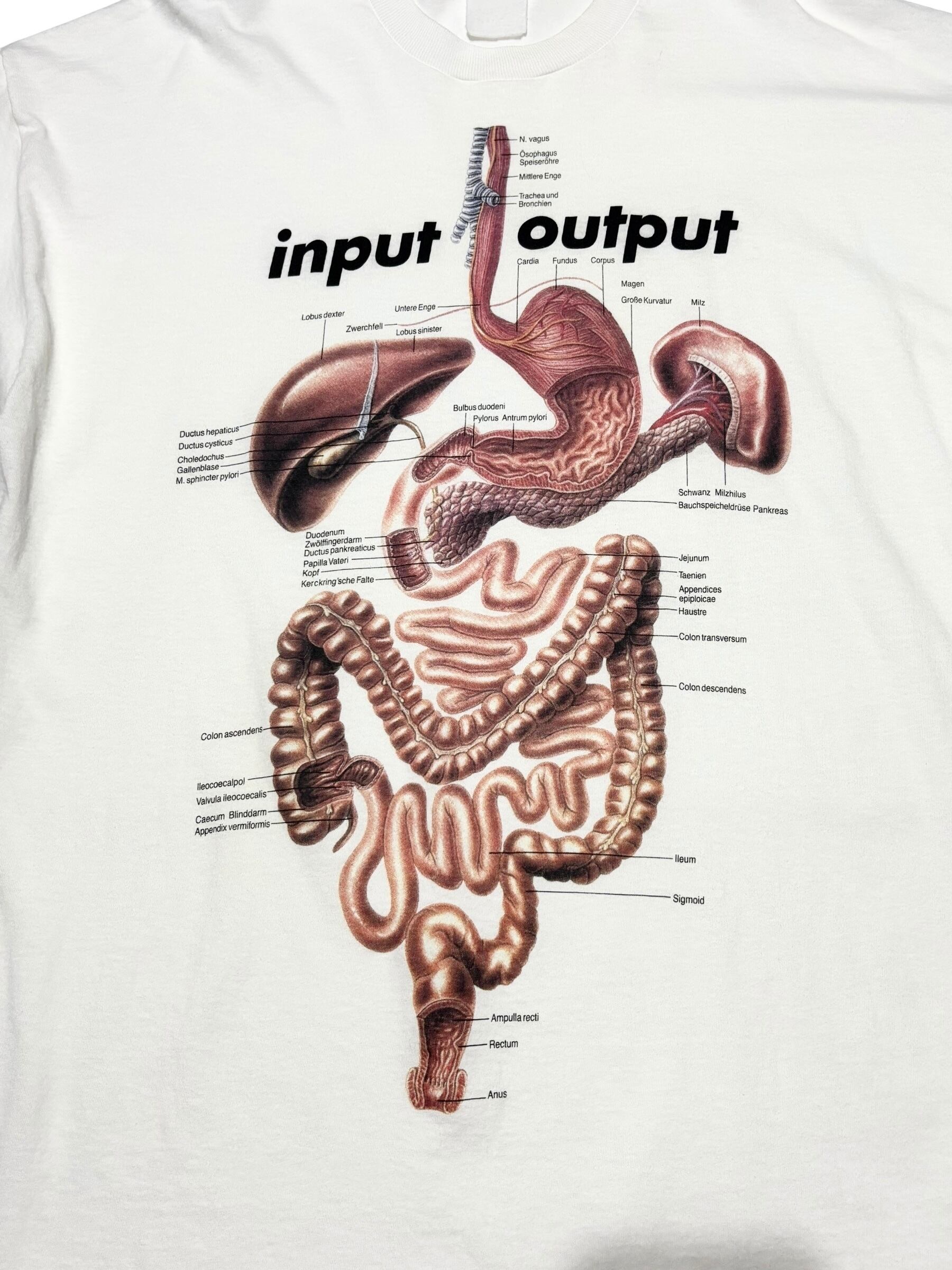 人体の消化器官をモチーフにしたユニークなアートTシャツ。フロントに大きく描かれた胃腸の解剖図と「input / output」のテキストがインパクト抜群で、医学・サイエンス・アートが交差するようなデザイン性を感じさせます。カルチャーやサイエンス好きからファッション感度の高い層まで幅広く支持される一枚。