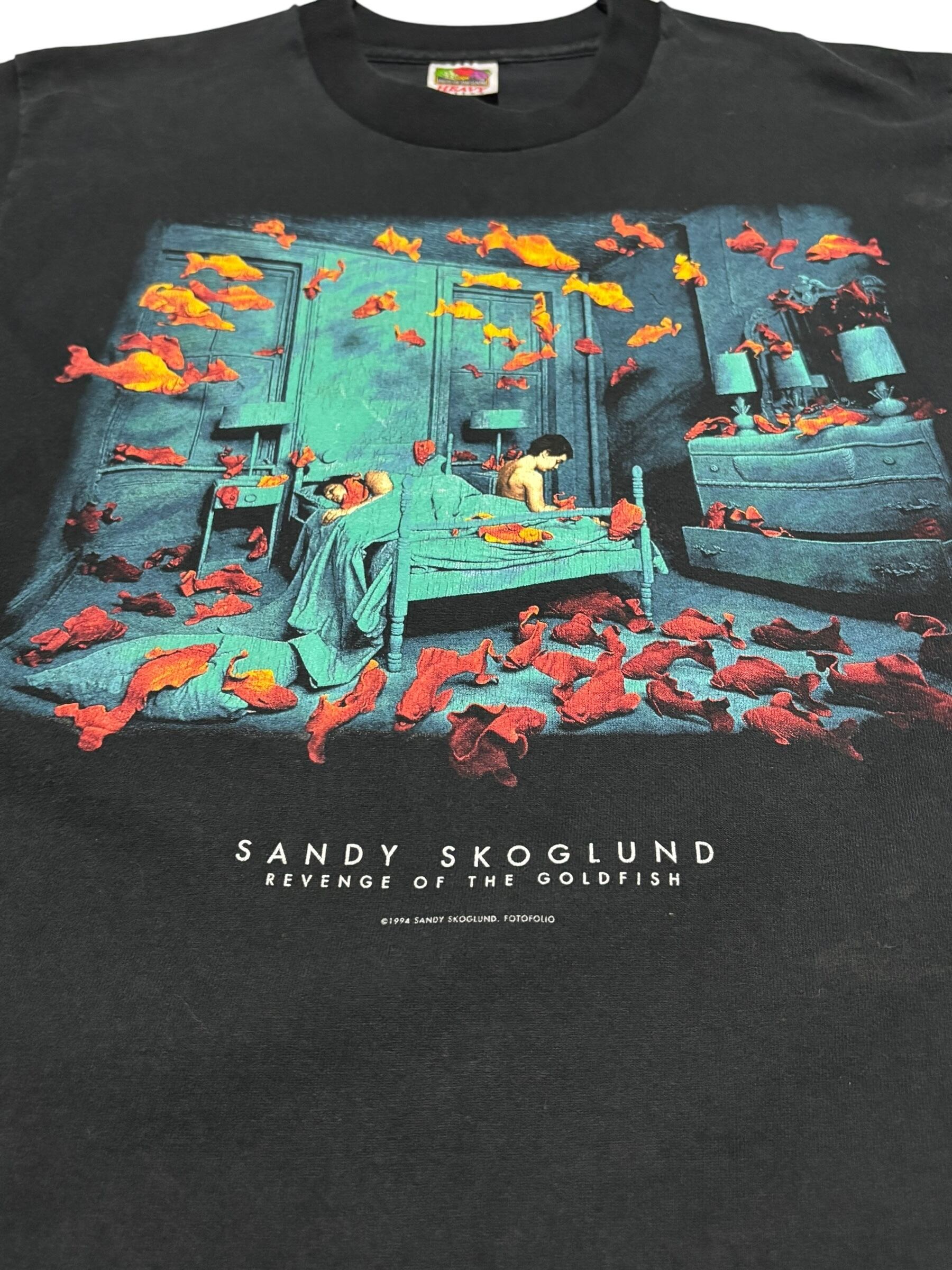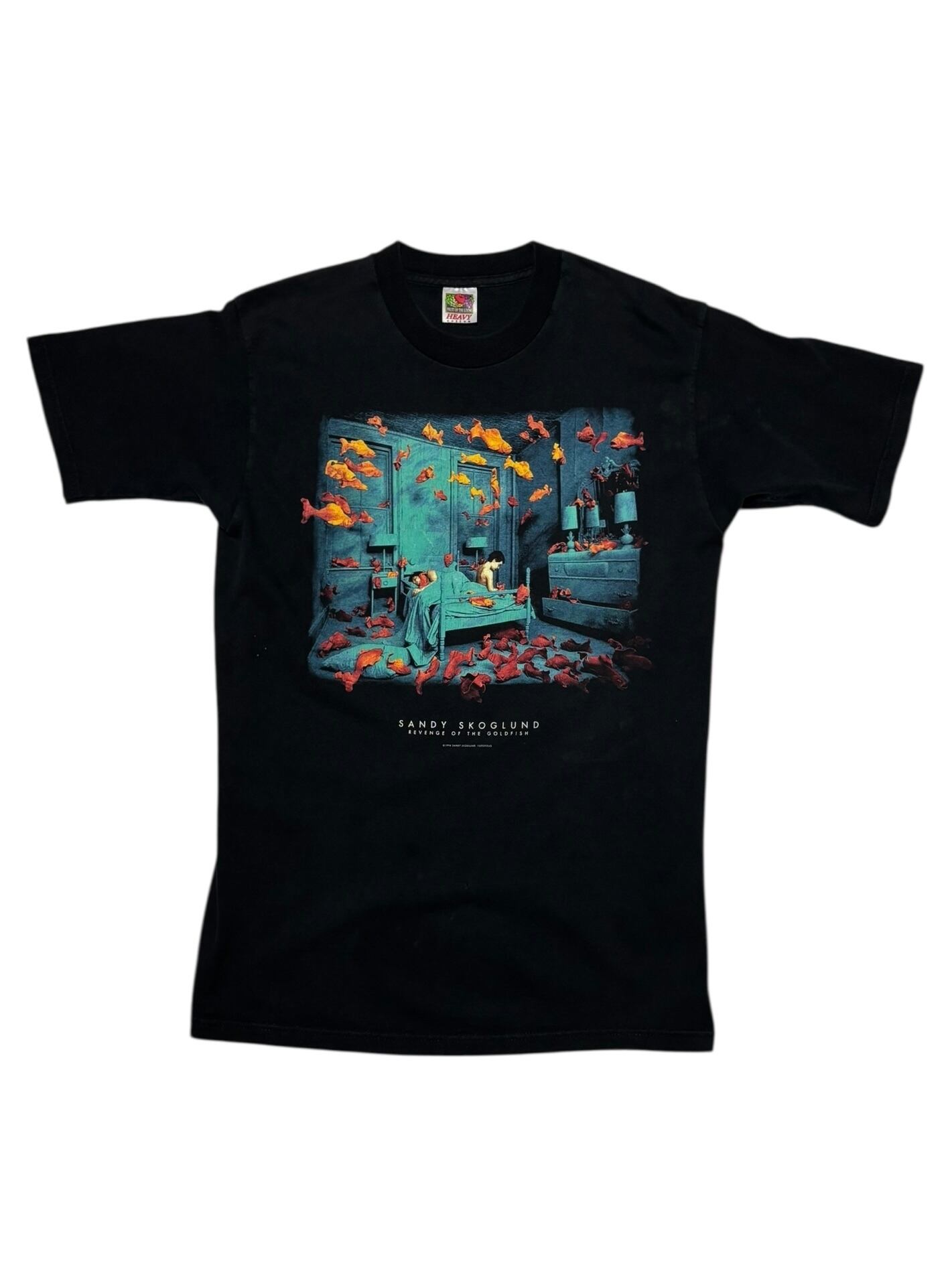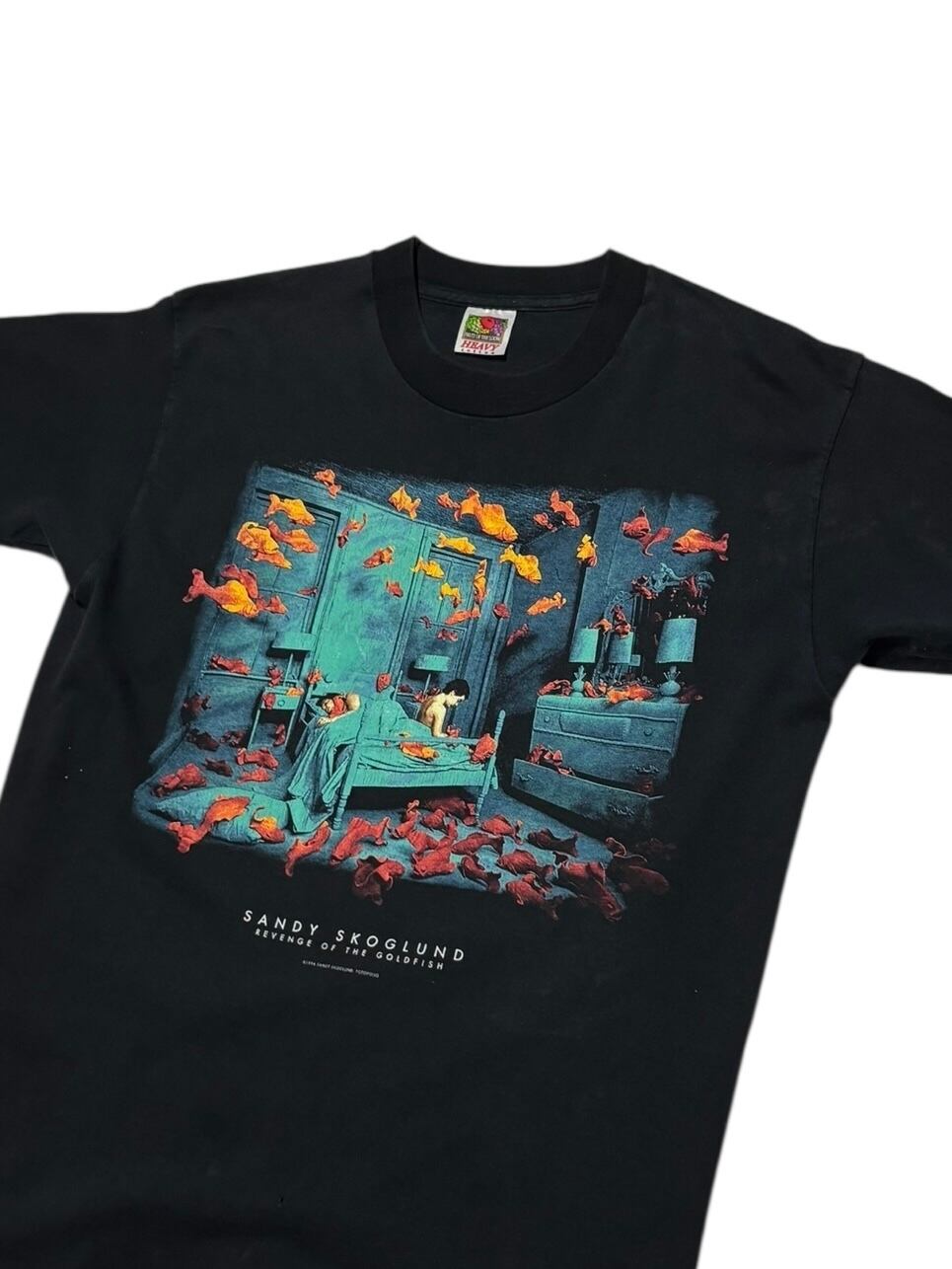 アメリカの現代美術家 Sandy Skoglund(サンディ・スコグランド) による代表作「Revenge of the Goldfish(復讐する金魚)」をフロント全面にプリントしたアートTシャツ。夢と現実が交錯するような幻想的な写真作品を落とし込んだデザインで、鮮やかな金魚と青緑色の室内が印象的に描かれています。コピーライトは1994年表記、当時のオリジナルでアートファン・ヴィンテージコレクター共に人気の高い1枚です。