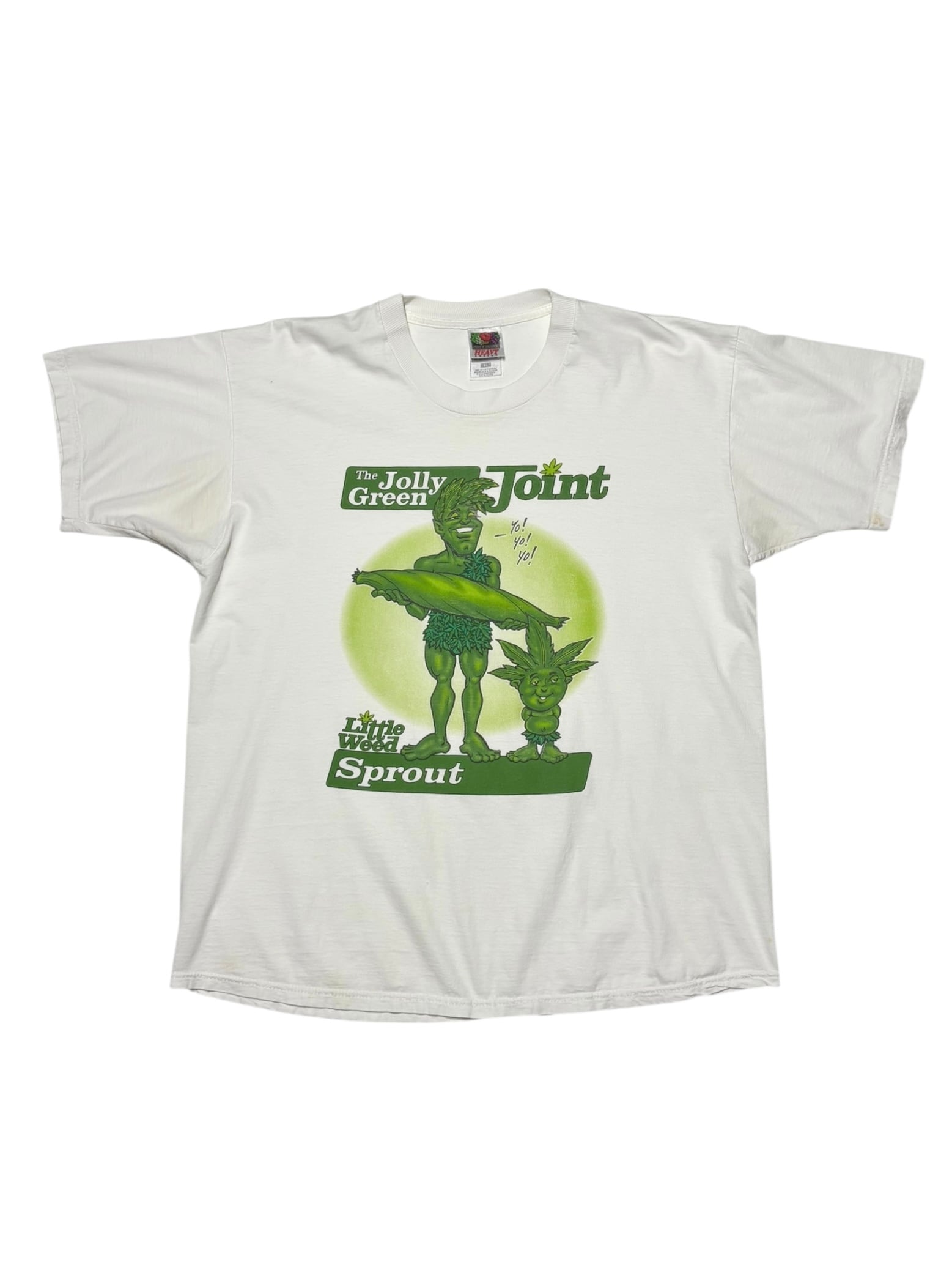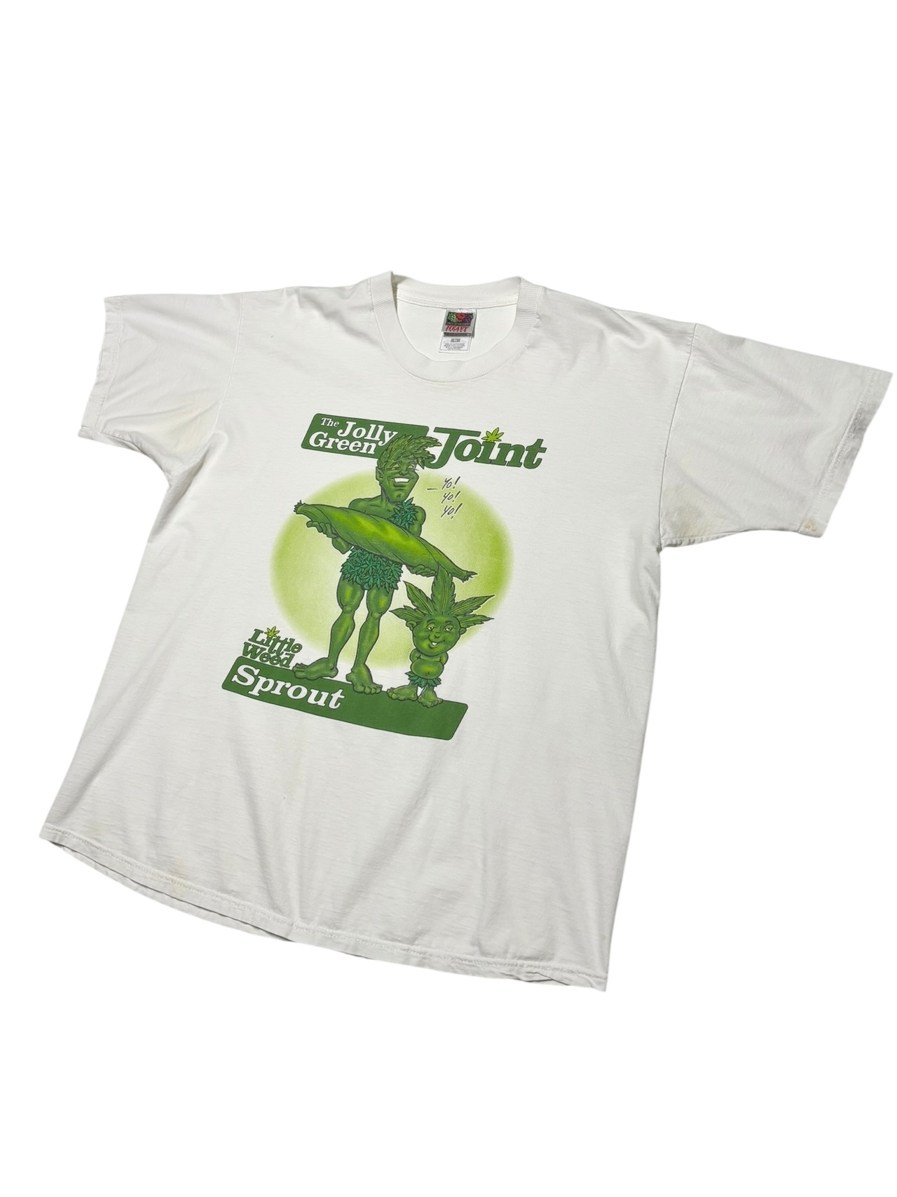 アメリカの食品キャラクター「Jolly Green Giant(グリーンジャイアント)」をモチーフにした90sカルチャー感あふれるパロディTシャツ。胸元には「Jolly Green Joint」「Little Weed Sprout」とウィットに富んだ文字が入り、大きなグリーンのキャラクターがポップに描かれています。ユーモアとサブカルチャーを感じさせるプリントで、ストリートファッションのアクセントにもおすすめの1枚です。