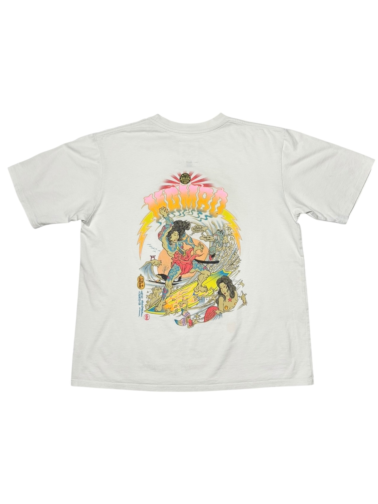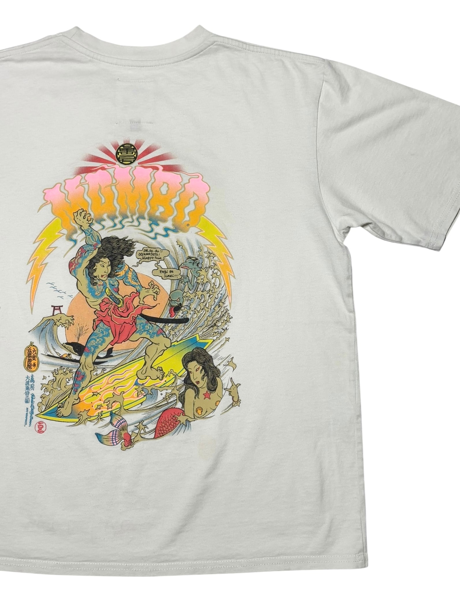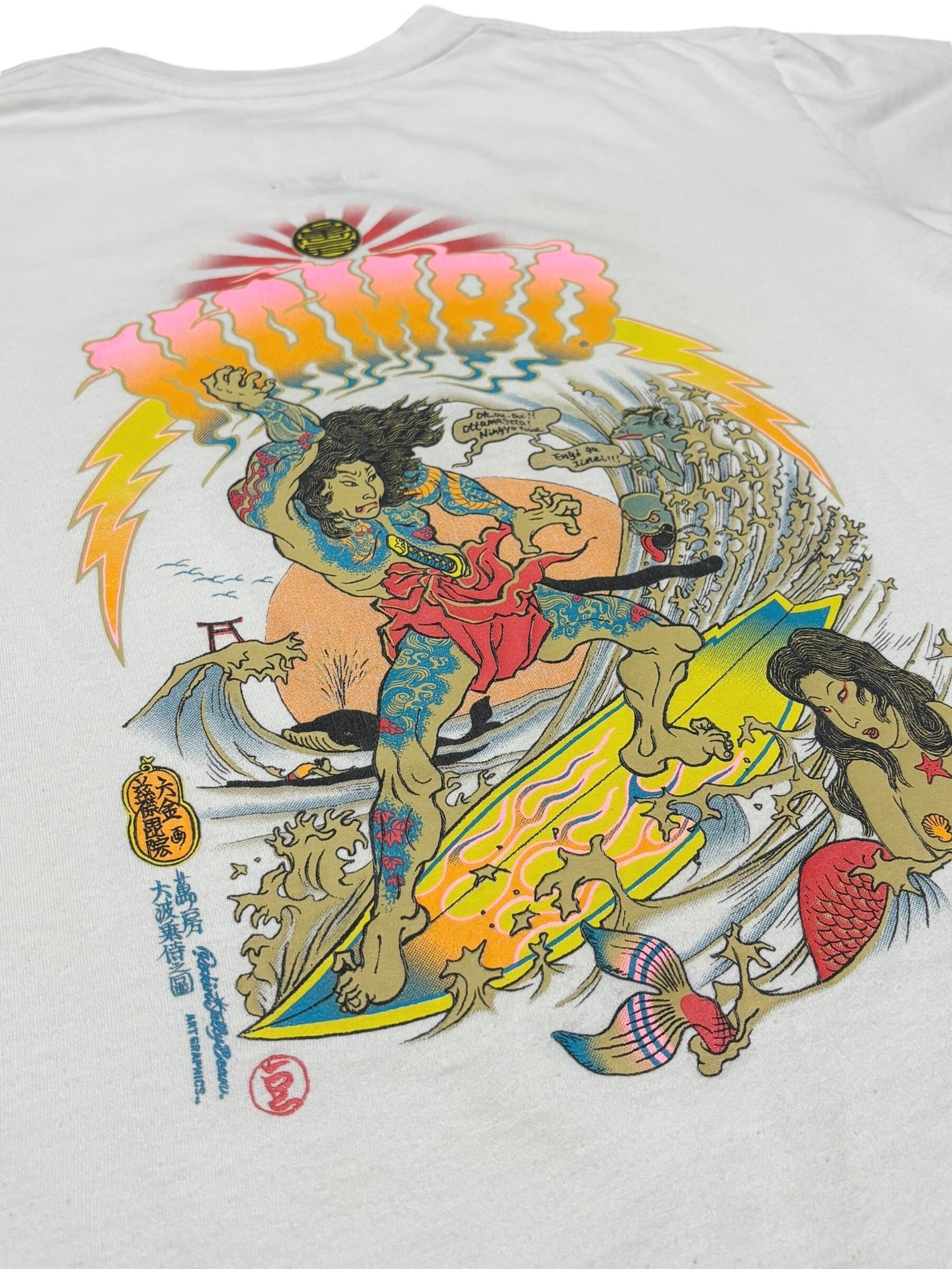 オーストラリア発のサーフブランド Mambo による、独創的な和風アートデザインの両面プリントTシャツ。フロントには波間に浮かぶサーフボード、バックには浮世絵調のサーファーと人魚のグラフィックが大胆に描かれ、サーフカルチャーとジャパニーズアートを融合させたユーモア溢れる一枚。