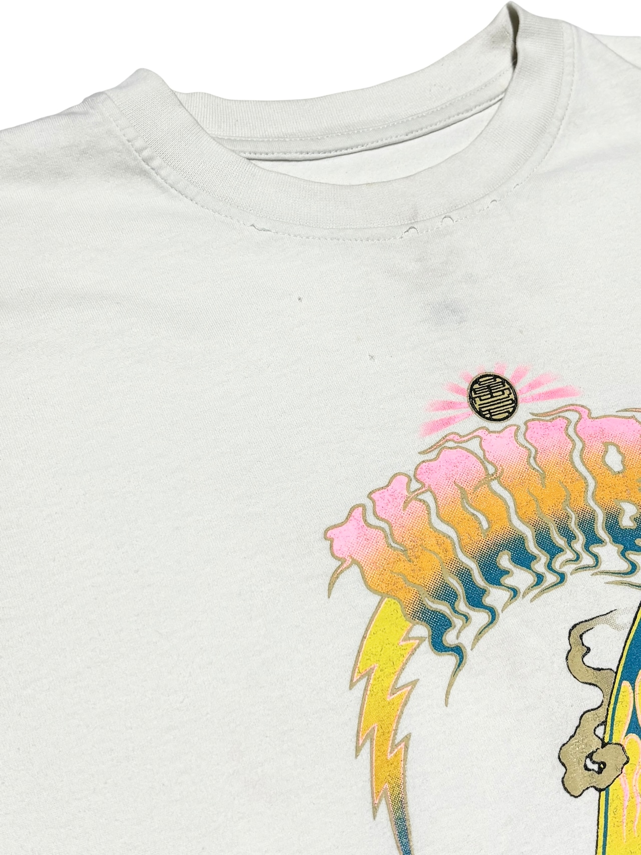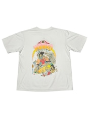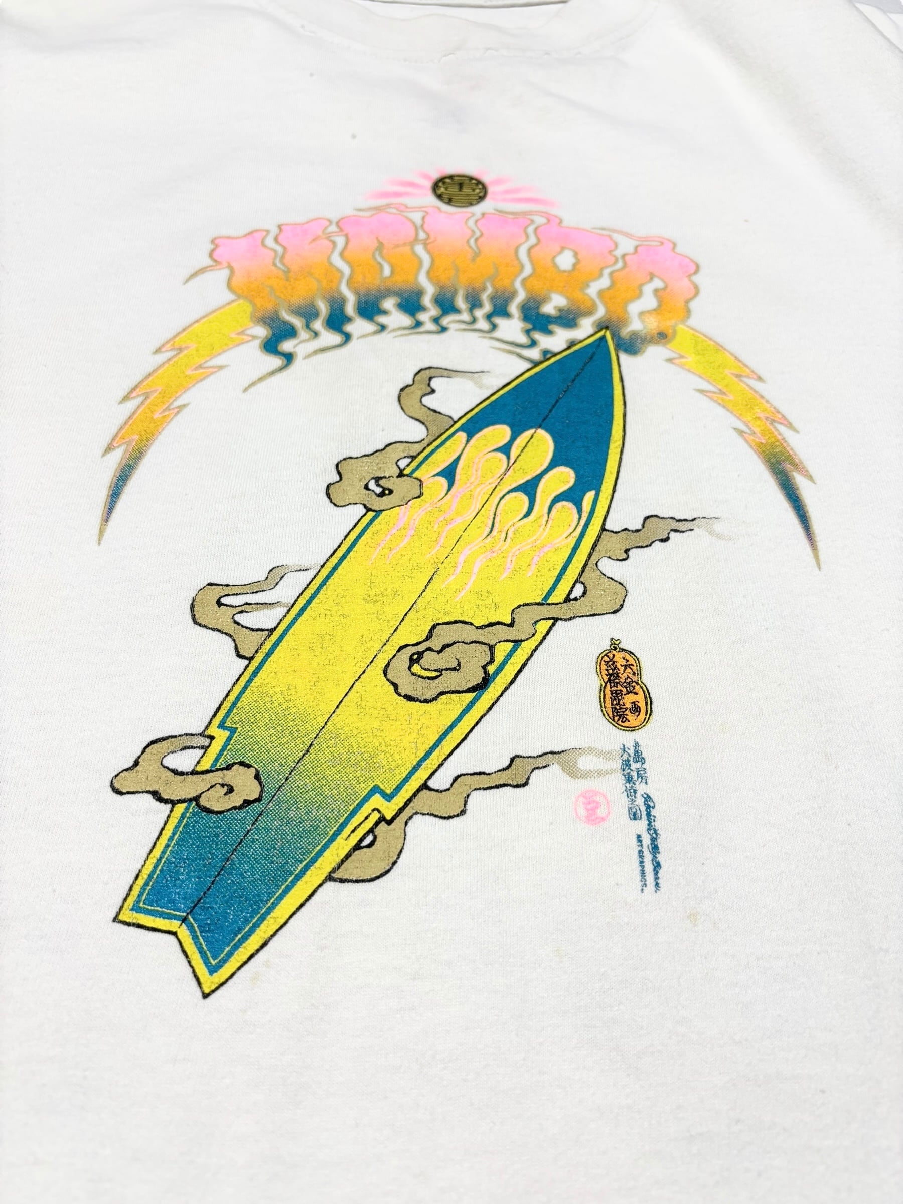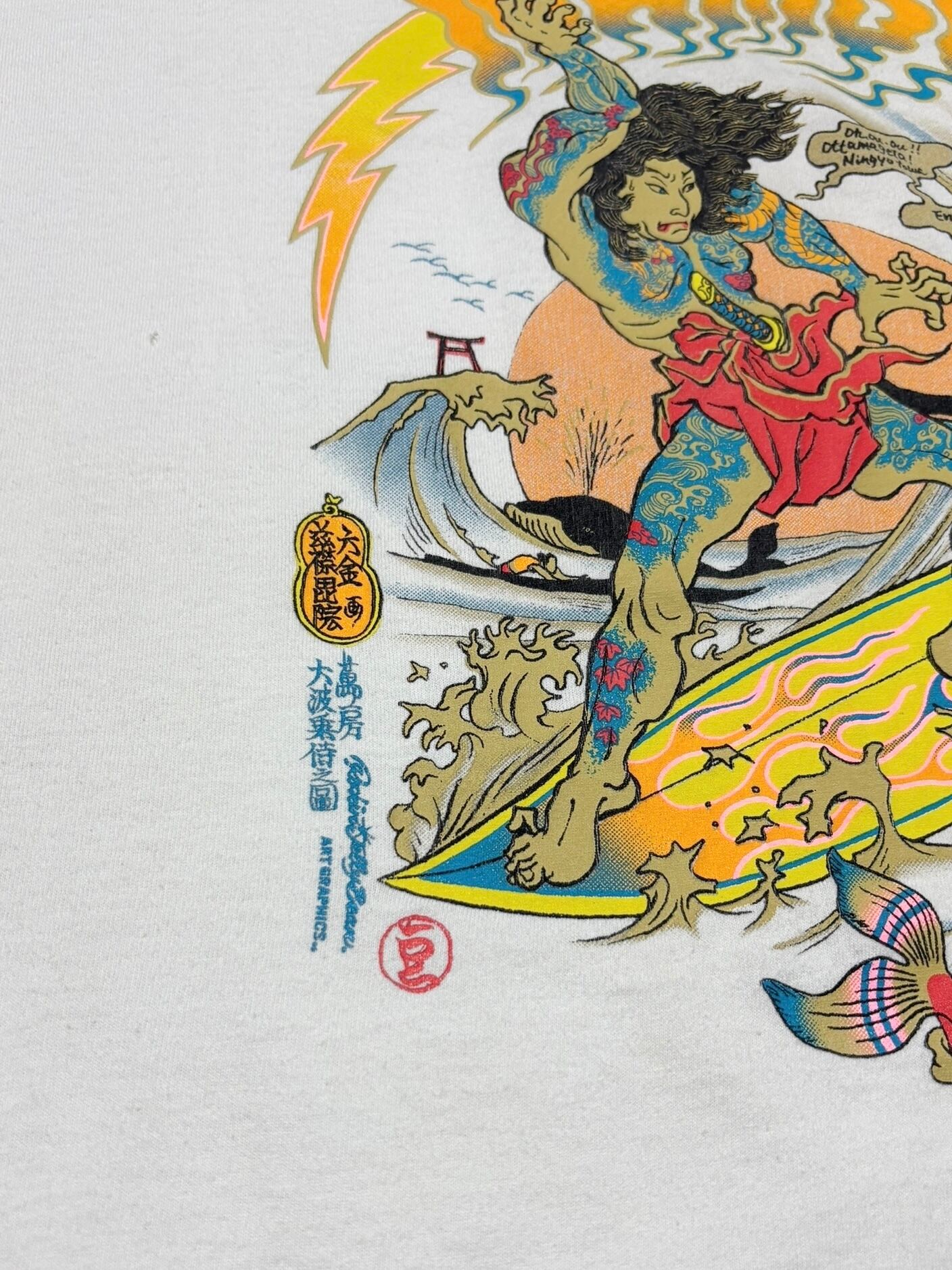 オーストラリア発のサーフブランド Mambo による、独創的な和風アートデザインの両面プリントTシャツ。フロントには波間に浮かぶサーフボード、バックには浮世絵調のサーファーと人魚のグラフィックが大胆に描かれ、サーフカルチャーとジャパニーズアートを融合させたユーモア溢れる一枚。