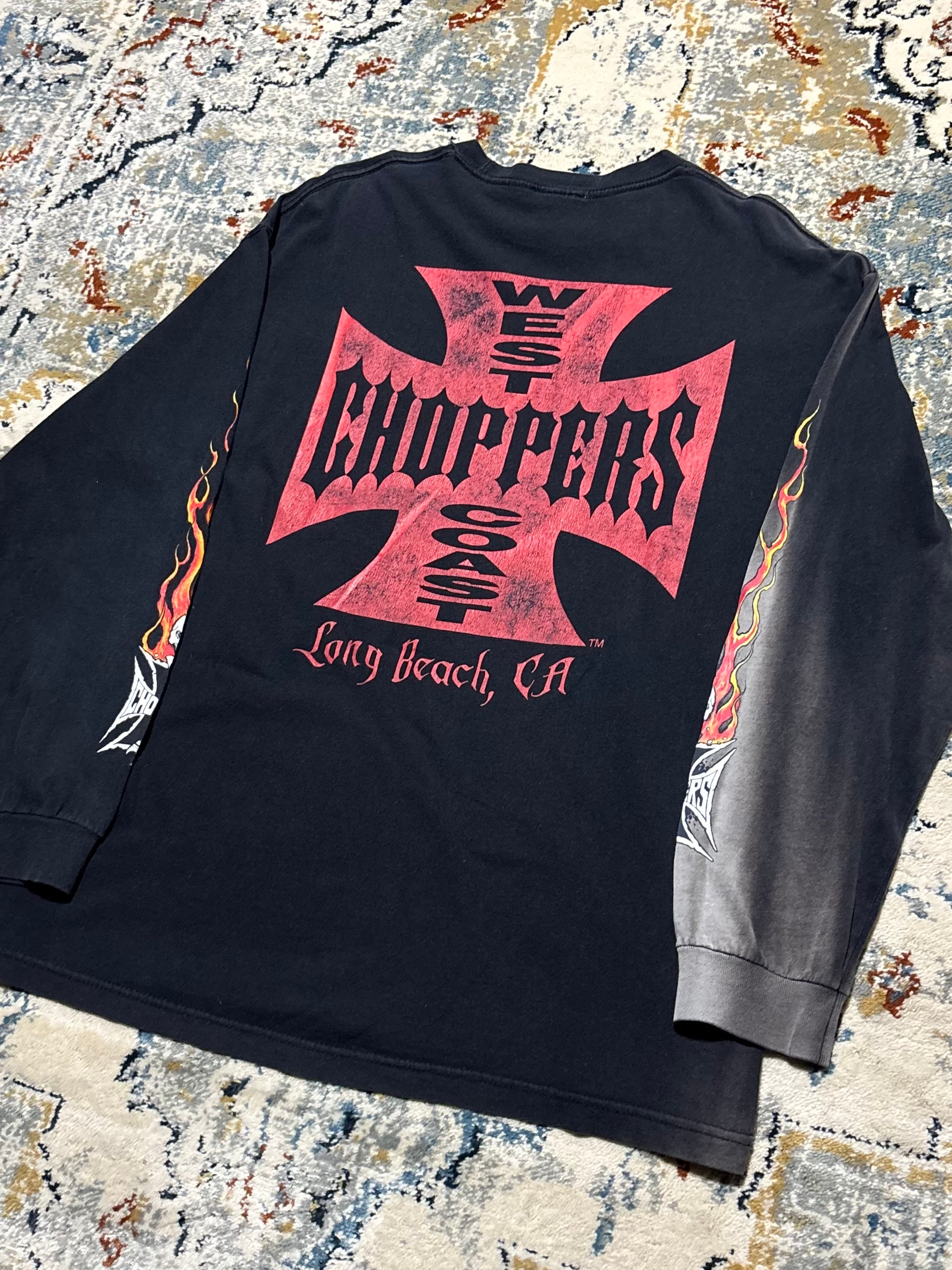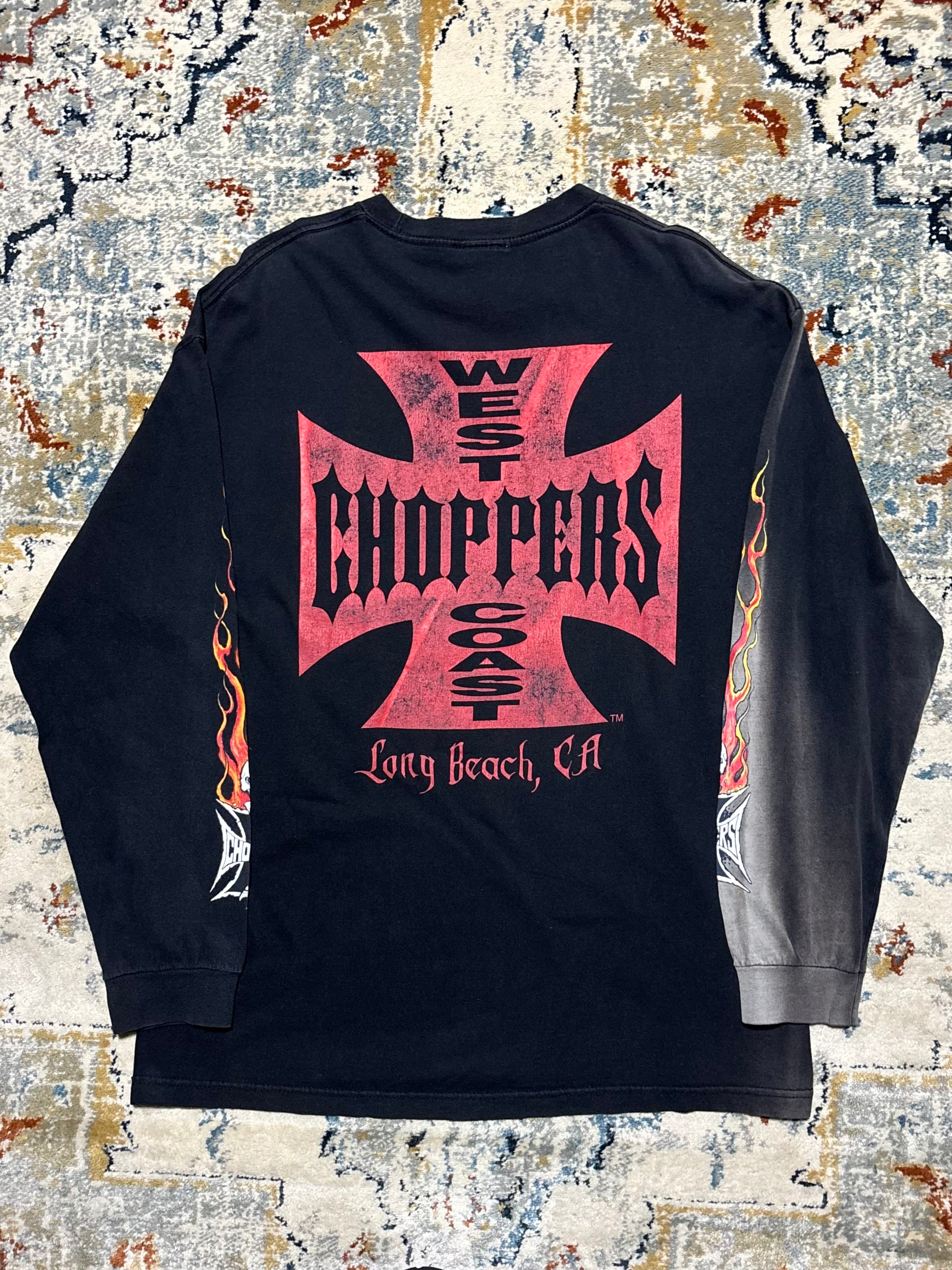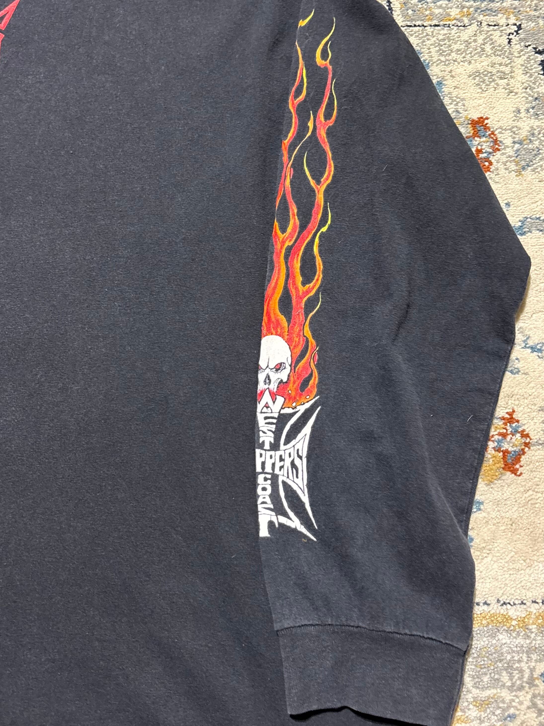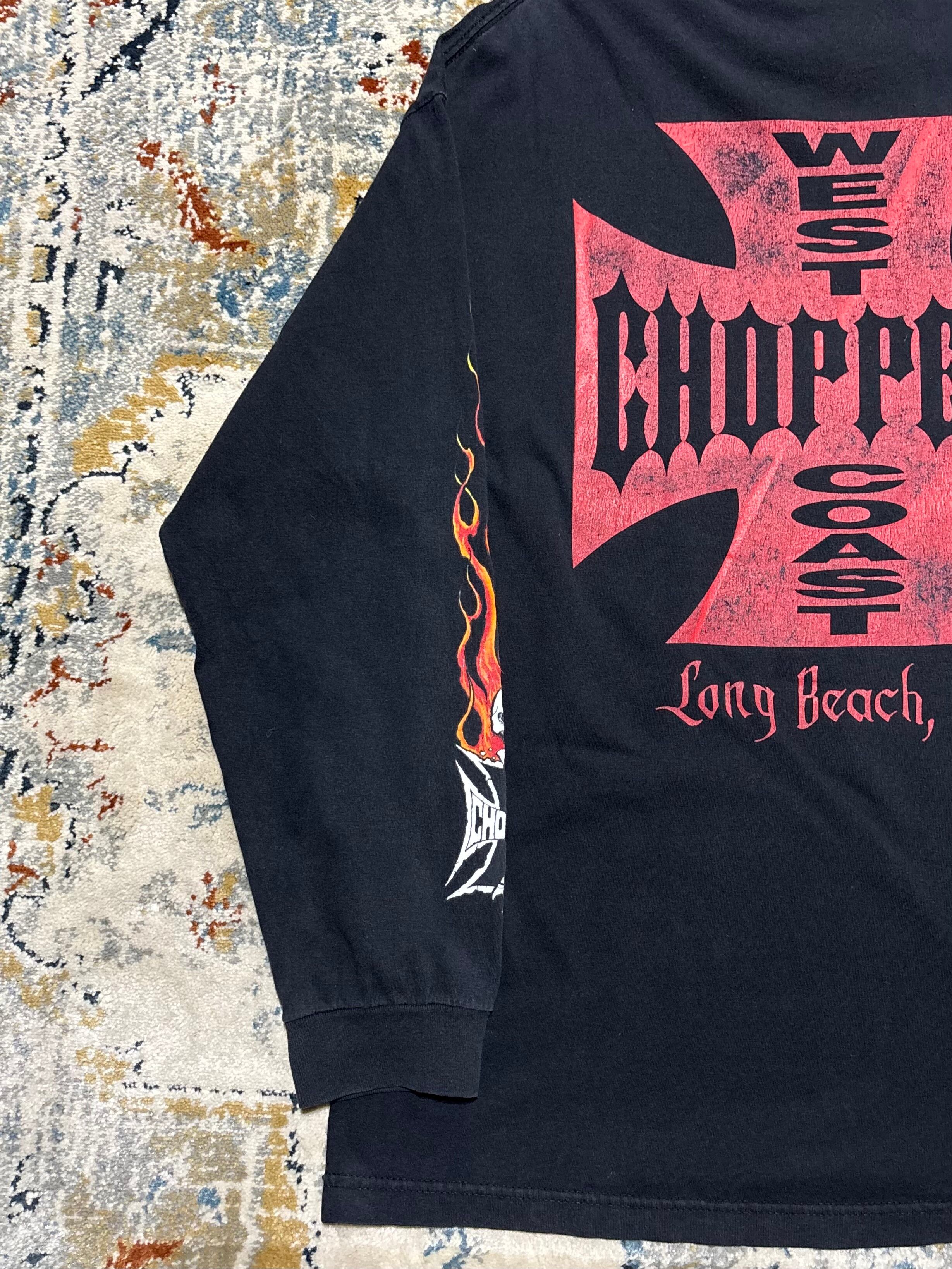 アメリカのバイクカルチャーを象徴するブランド「West Coast Choppers」のロングスリーブTシャツ。バックには大判のクロスロゴ、両袖には燃え上がるフレイムとスカルのグラフィックが落とし込まれ、90s〜2000sバイカーシーンを感じさせる一枚。ストリート×ハードな雰囲気が魅力です。
