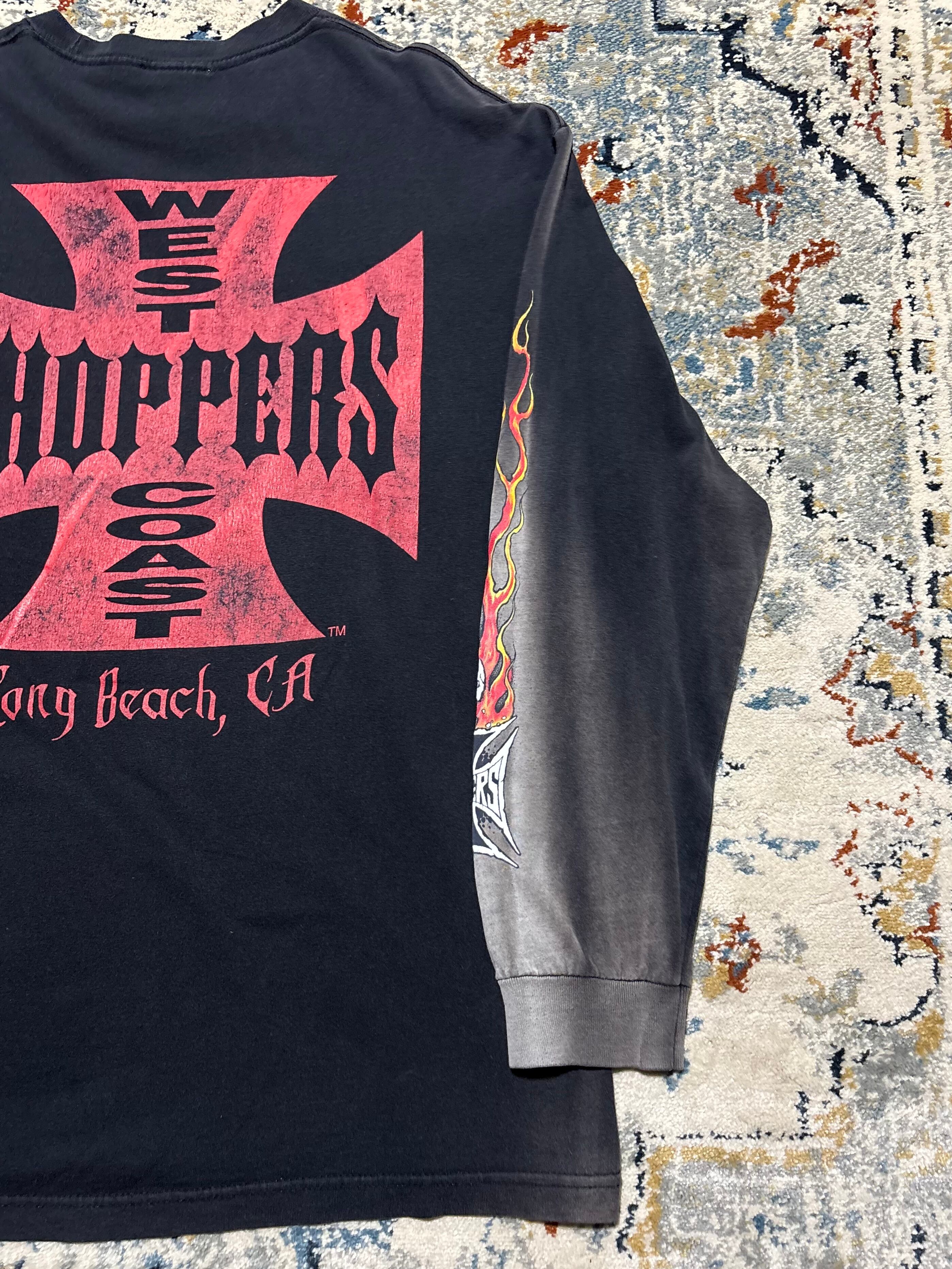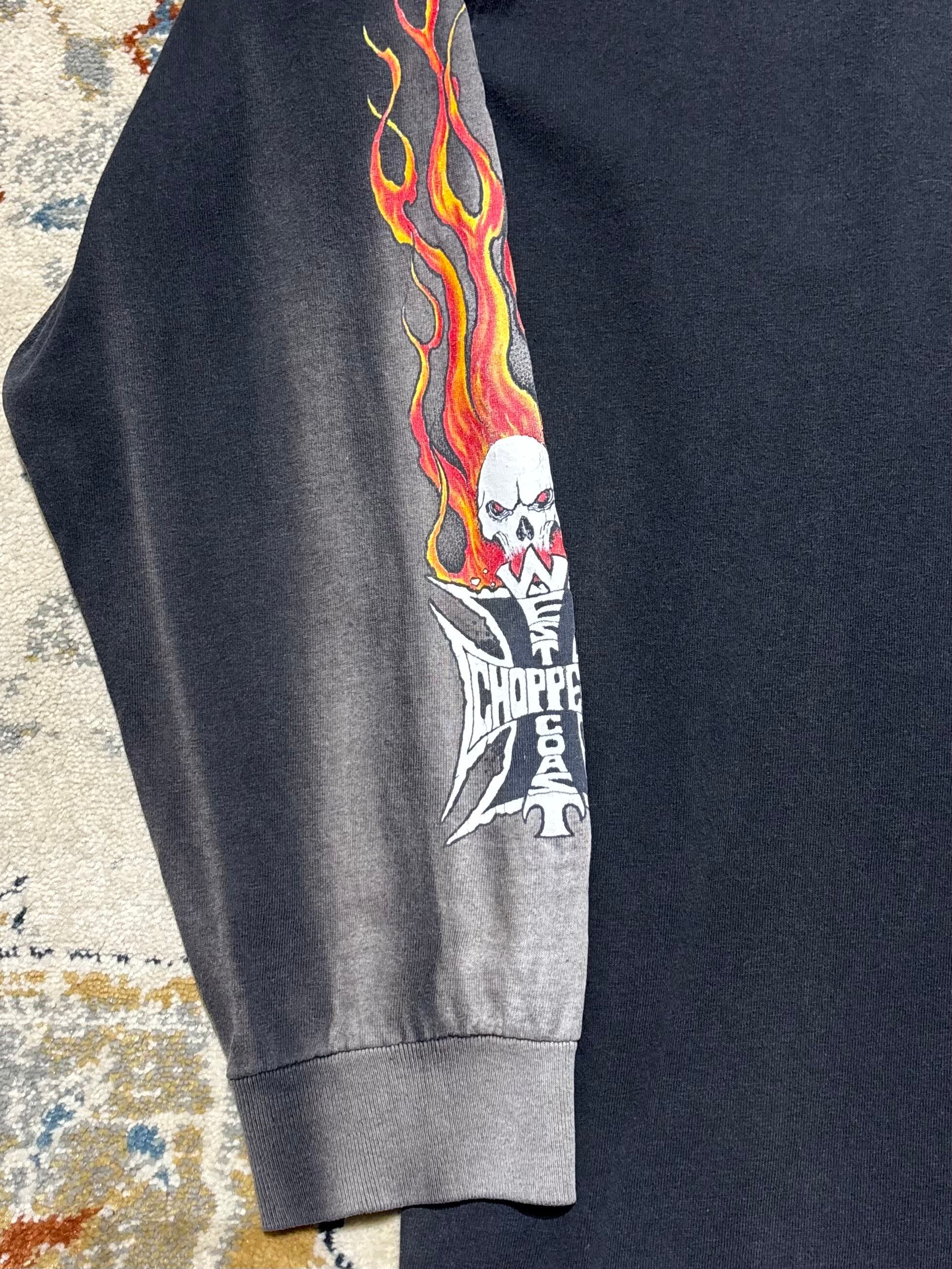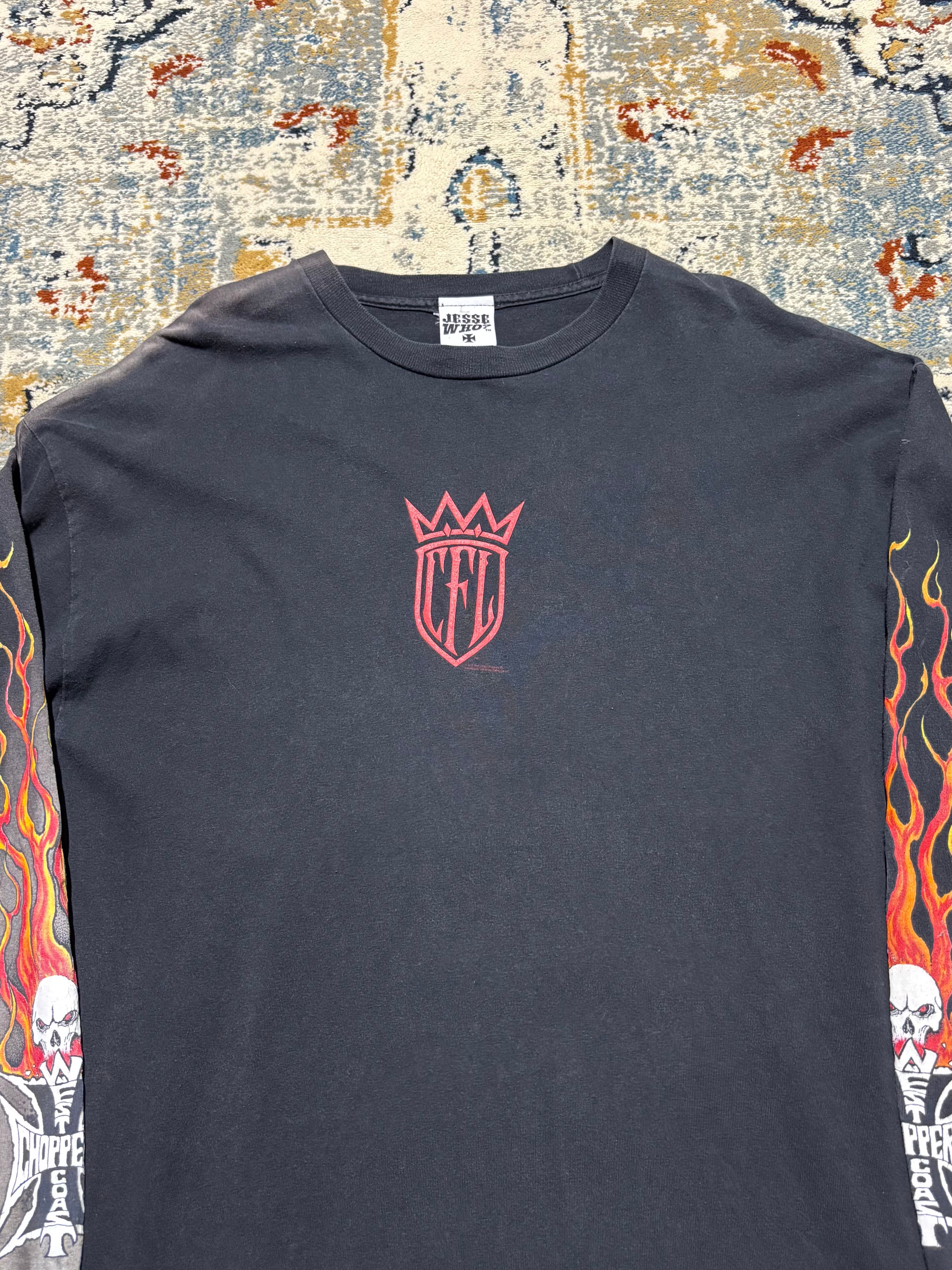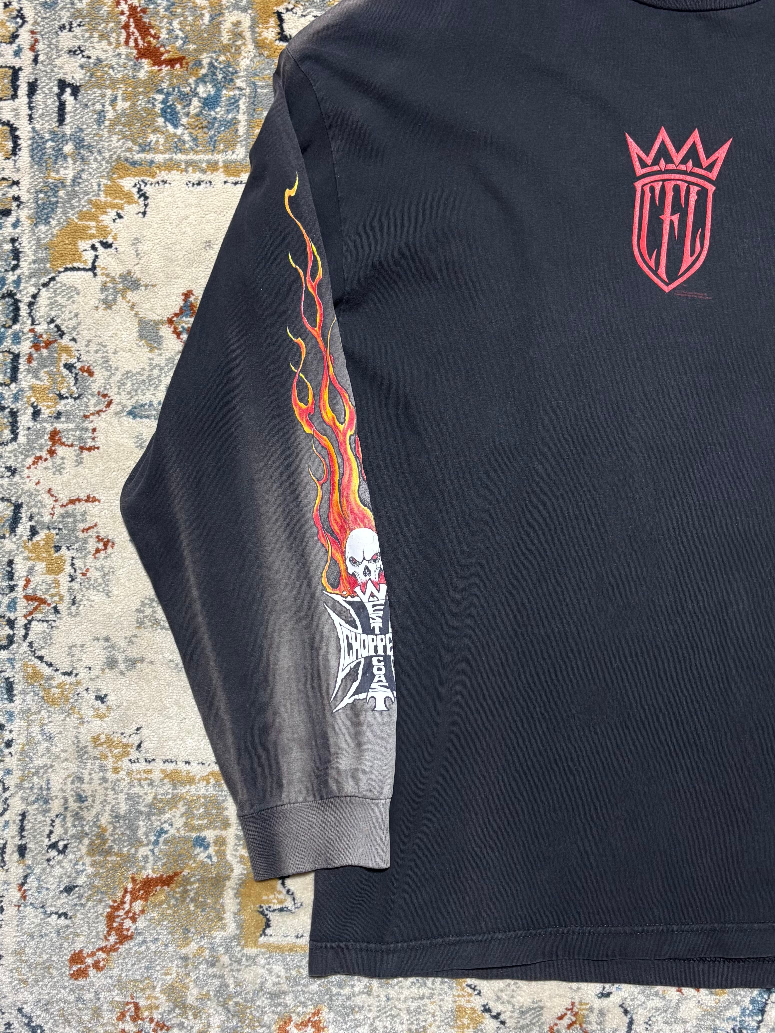 アメリカのバイクカルチャーを象徴するブランド「West Coast Choppers」のロングスリーブTシャツ。バックには大判のクロスロゴ、両袖には燃え上がるフレイムとスカルのグラフィックが落とし込まれ、90s〜2000sバイカーシーンを感じさせる一枚。ストリート×ハードな雰囲気が魅力です。