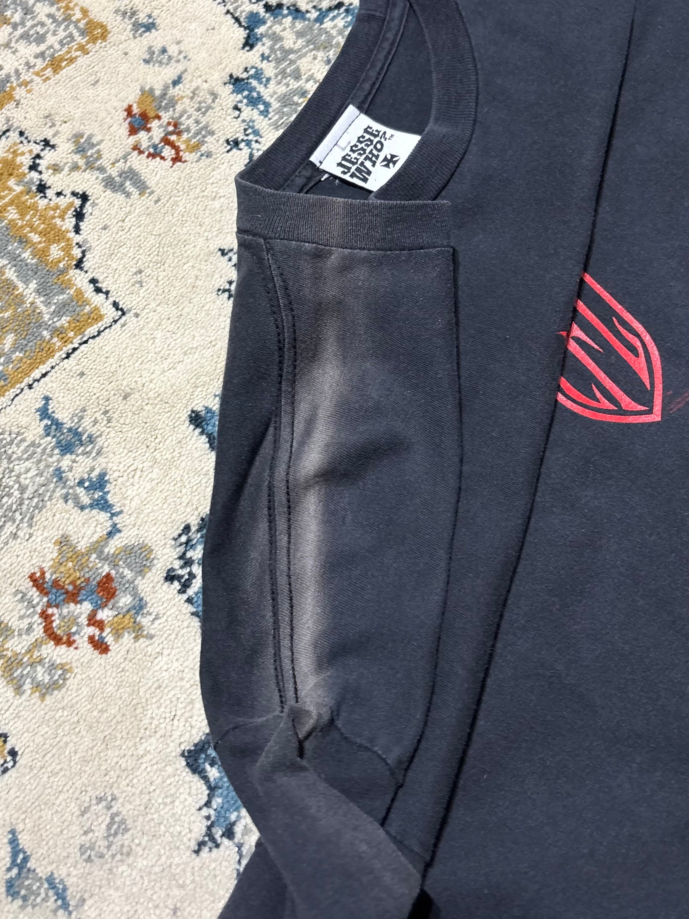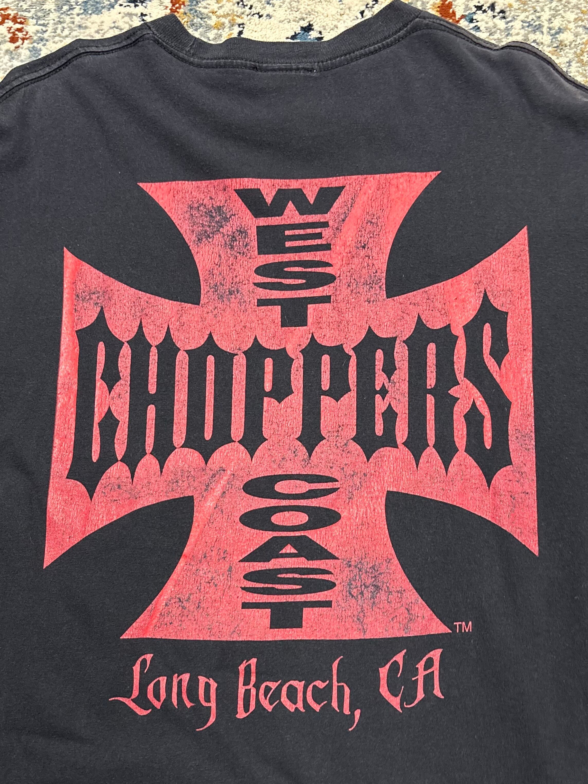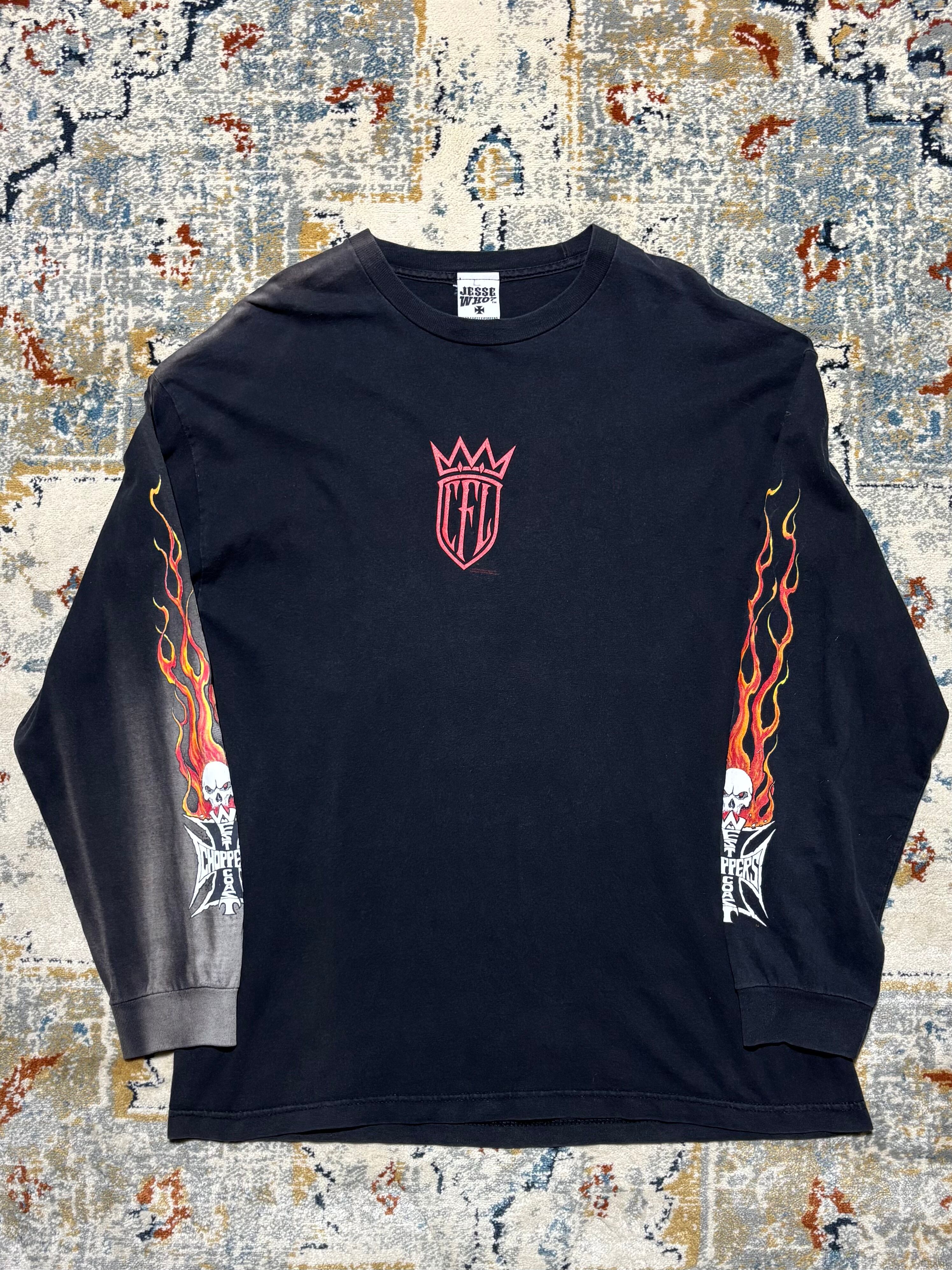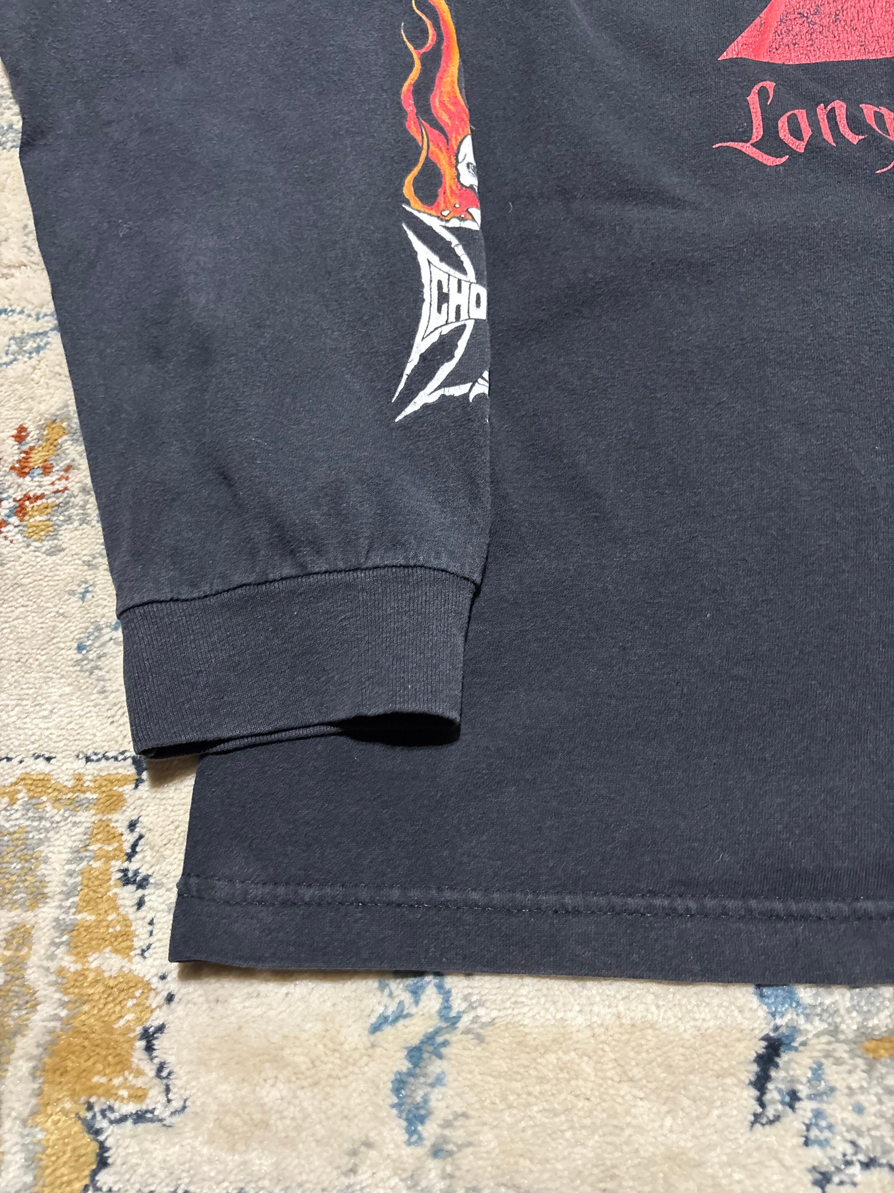 アメリカのバイクカルチャーを象徴するブランド「West Coast Choppers」のロングスリーブTシャツ。バックには大判のクロスロゴ、両袖には燃え上がるフレイムとスカルのグラフィックが落とし込まれ、90s〜2000sバイカーシーンを感じさせる一枚。ストリート×ハードな雰囲気が魅力です。