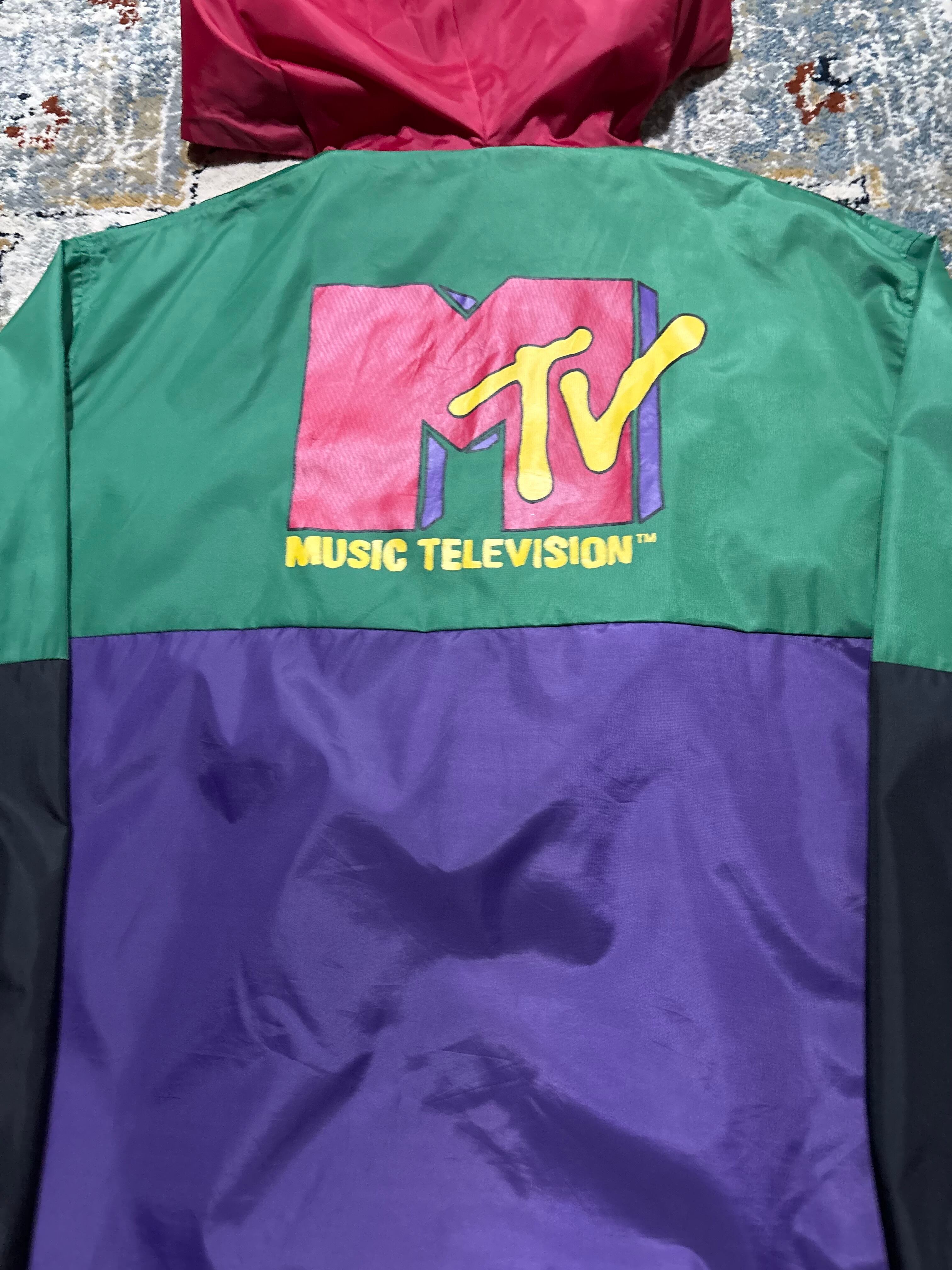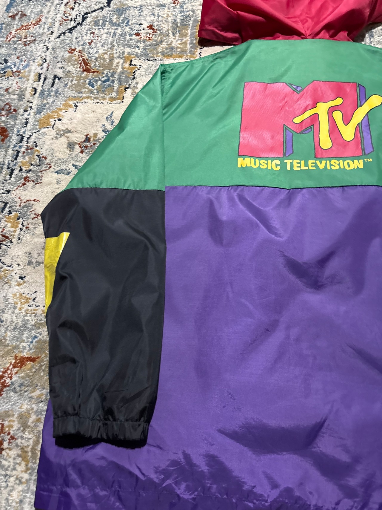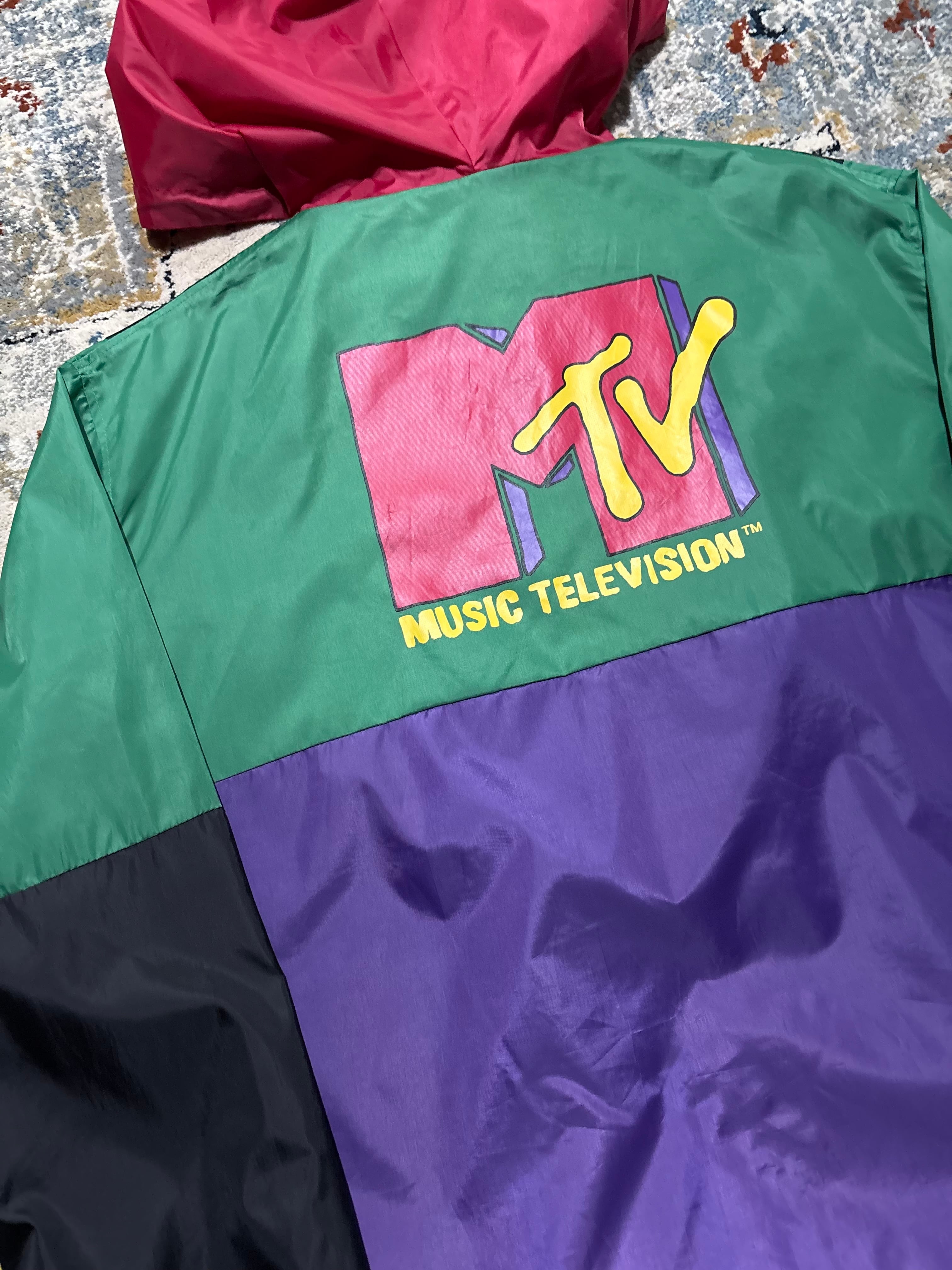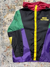 音楽カルチャーの象徴「MTV」のロゴが入ったナイロンジャケット。フロントには「MUSIC TELEVISION」のシンプルな文字デザイン、バックには大きくMTVロゴがプリントされ、90sのストリートやミュージックシーンを彷彿とさせる存在感のある一枚。レッド・グリーン・パープル・イエローを組み合わせたマルチカラーの切り替えデザインも魅力です。