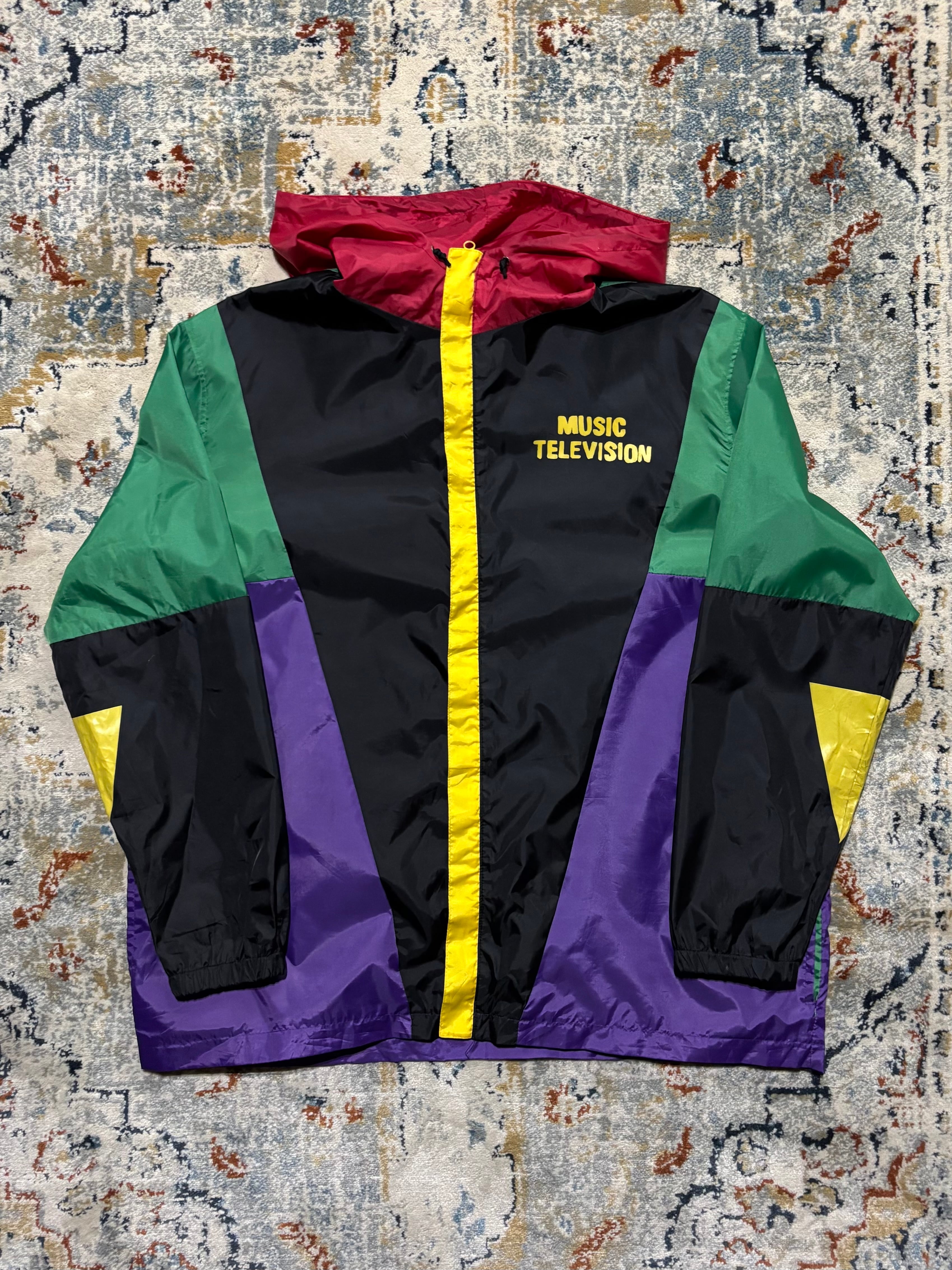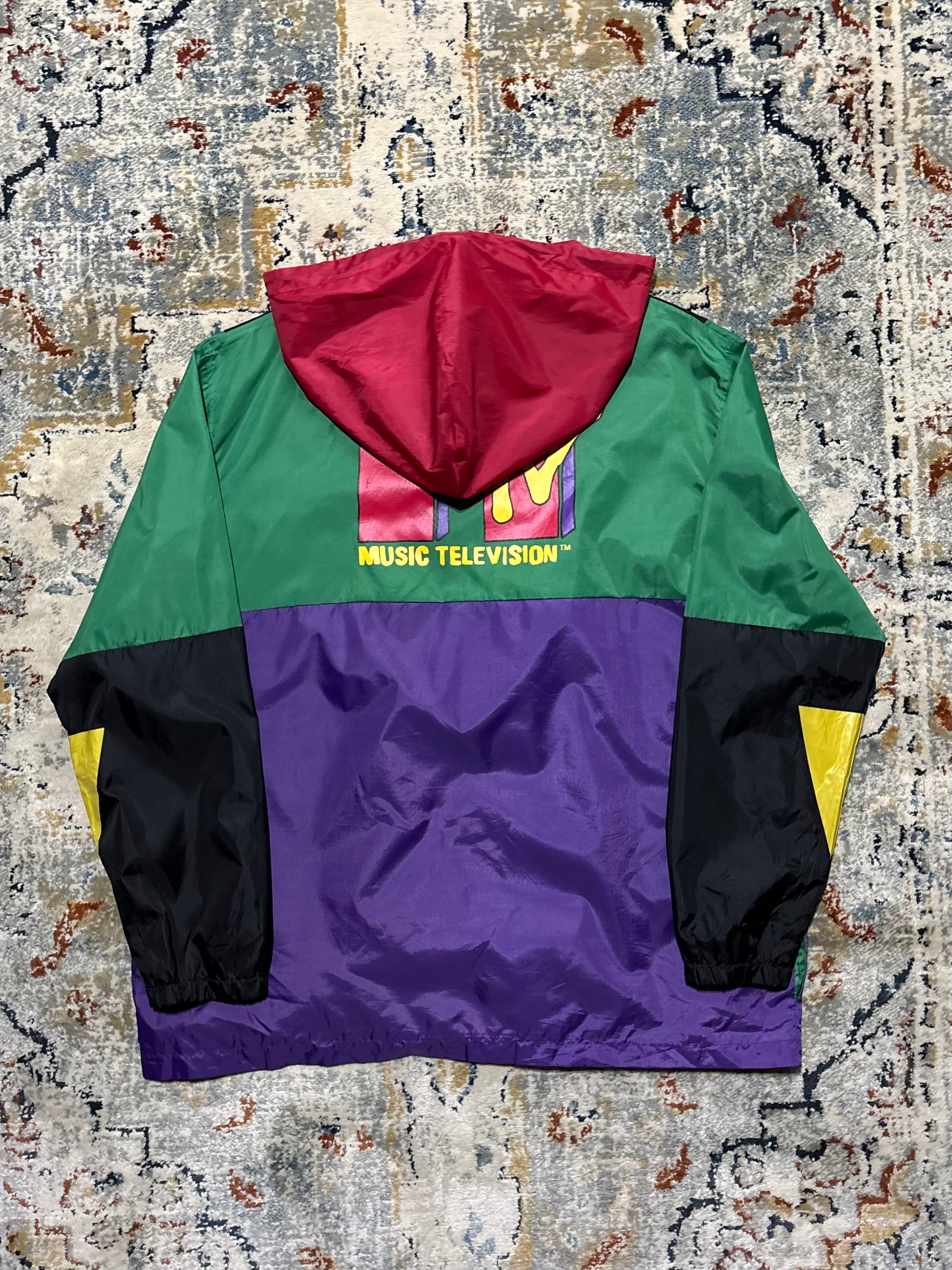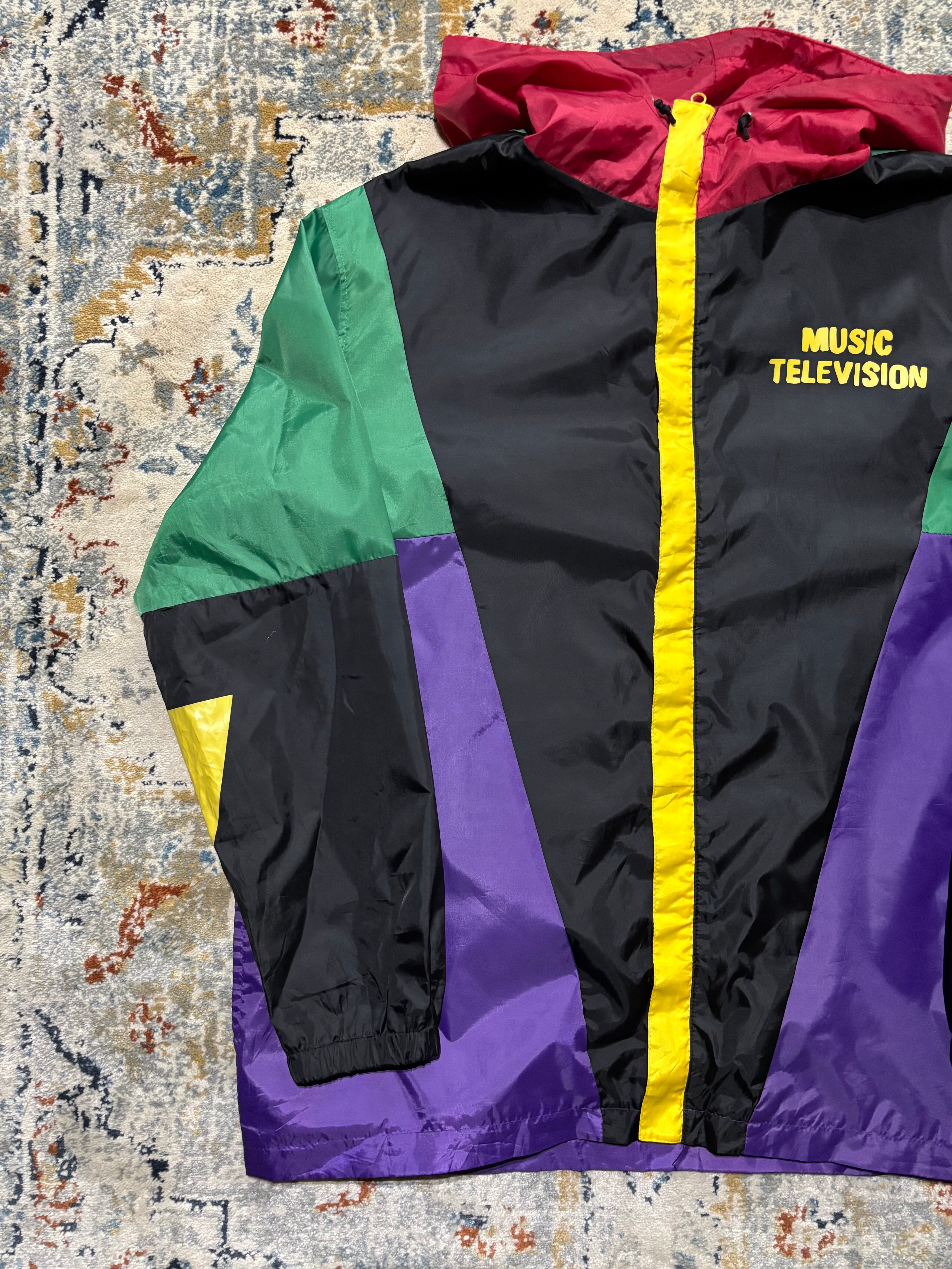 音楽カルチャーの象徴「MTV」のロゴが入ったナイロンジャケット。フロントには「MUSIC TELEVISION」のシンプルな文字デザイン、バックには大きくMTVロゴがプリントされ、90sのストリートやミュージックシーンを彷彿とさせる存在感のある一枚。レッド・グリーン・パープル・イエローを組み合わせたマルチカラーの切り替えデザインも魅力です。