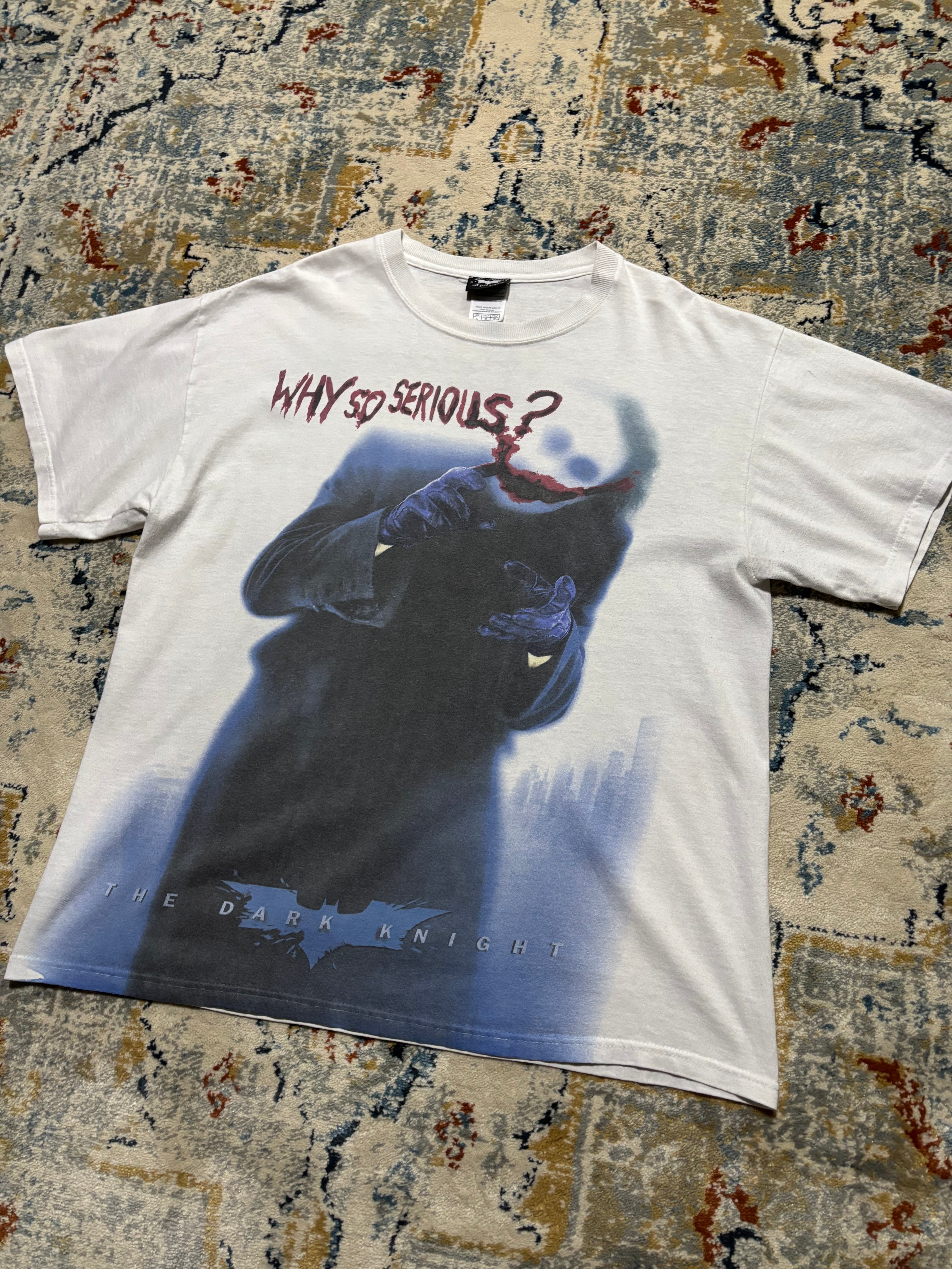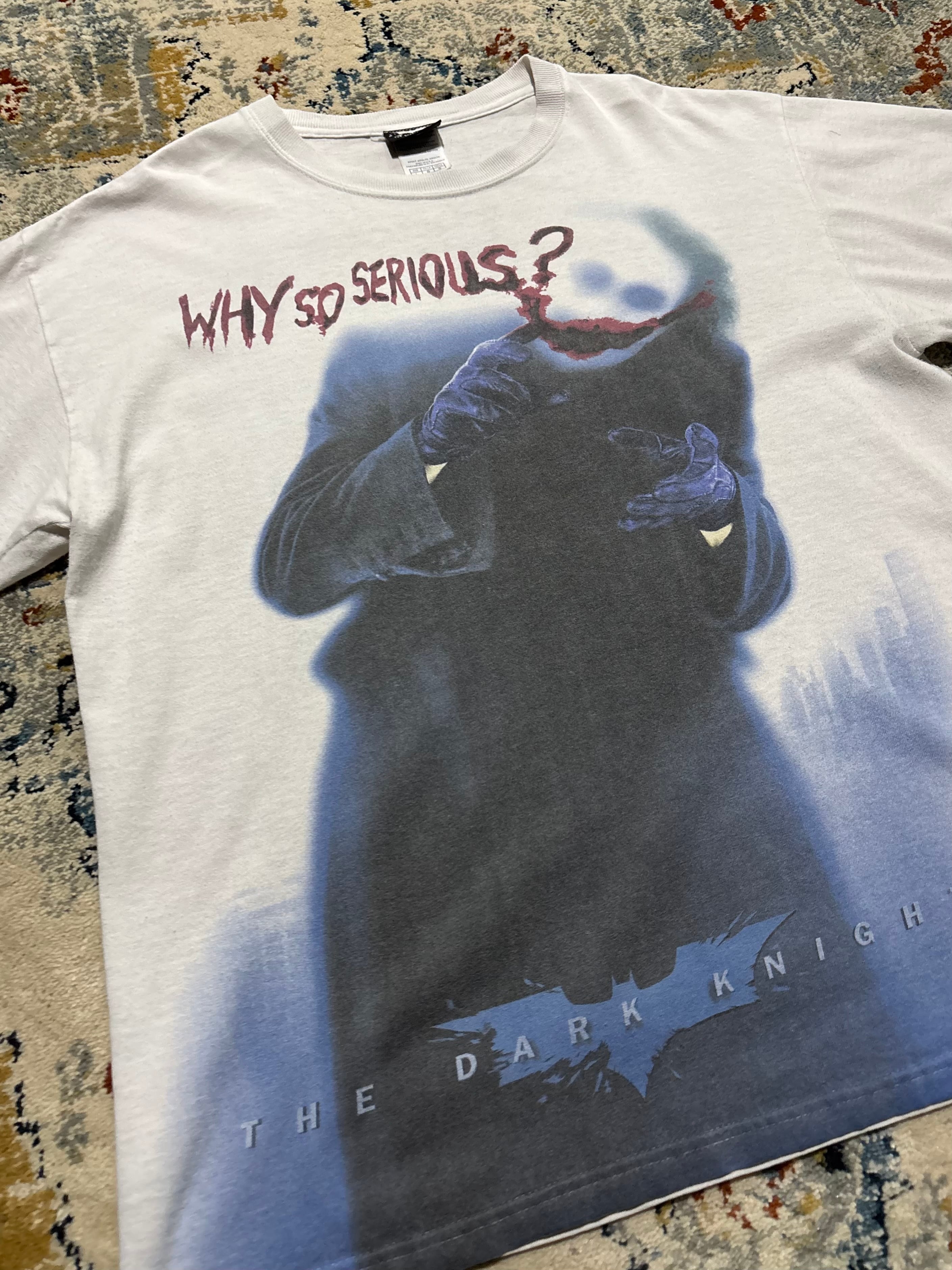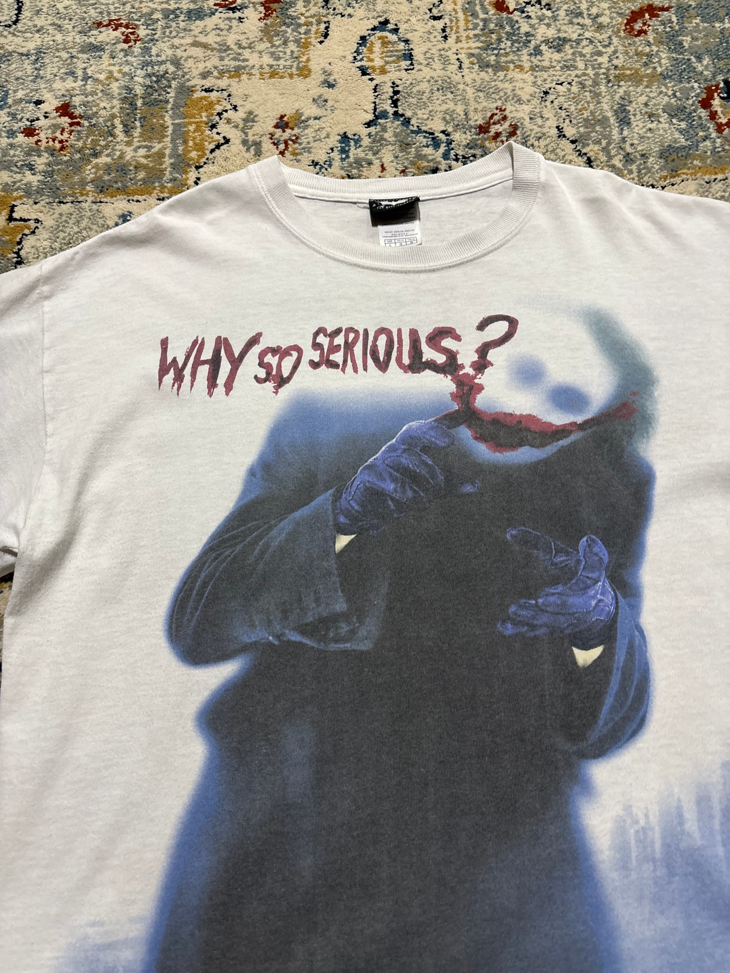 映画『ダークナイト』(2008年公開)の名シーンを切り取ったジョーカーTシャツ。フロントには「WHY SO SERIOUS?」の血文字とともに不気味なジョーカーの姿が大判プリントされ、下部にはバットマンのシンボルとタイトル「THE DARK KNIGHT」の文字が入るオフィシャルデザイン。映画ファン、ヴィラン好きに強烈な存在感を放つ一枚です。
